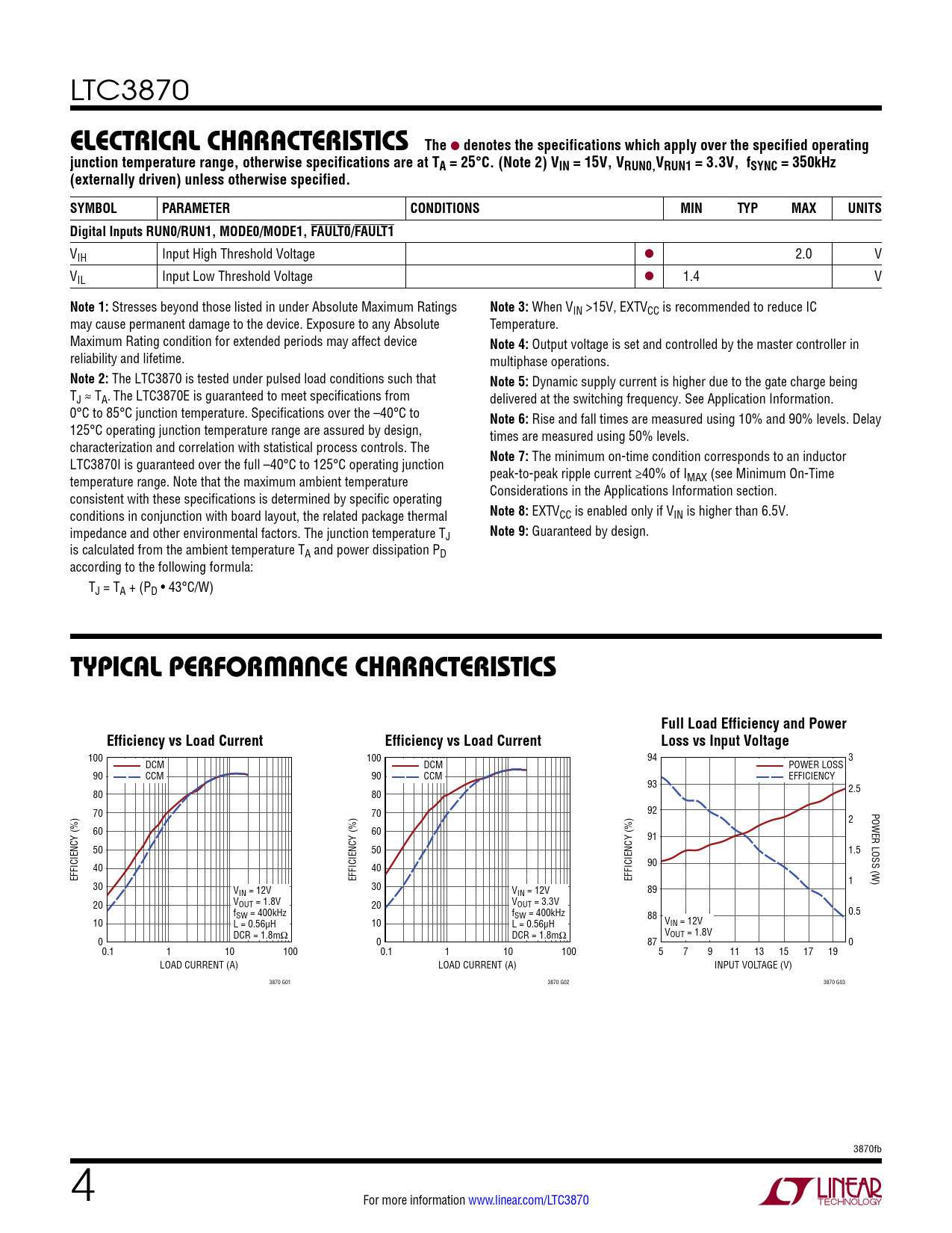 denotes the specifications which apply over the specified operating junction temperature range, otherwise specifications are at TA = 25°C. (Note 2) VIN = 15V, VRUN0,VRUN1 = 3.3V, fSYNC = 350kHz (externally driven) unless otherwise specified. SYMBOL PARAMETER CONDITIONS MIN TYP MAX UNITS Digital Inputs RUN0/RUN1, MODE0/MODE1, FAULT0/FAULT1