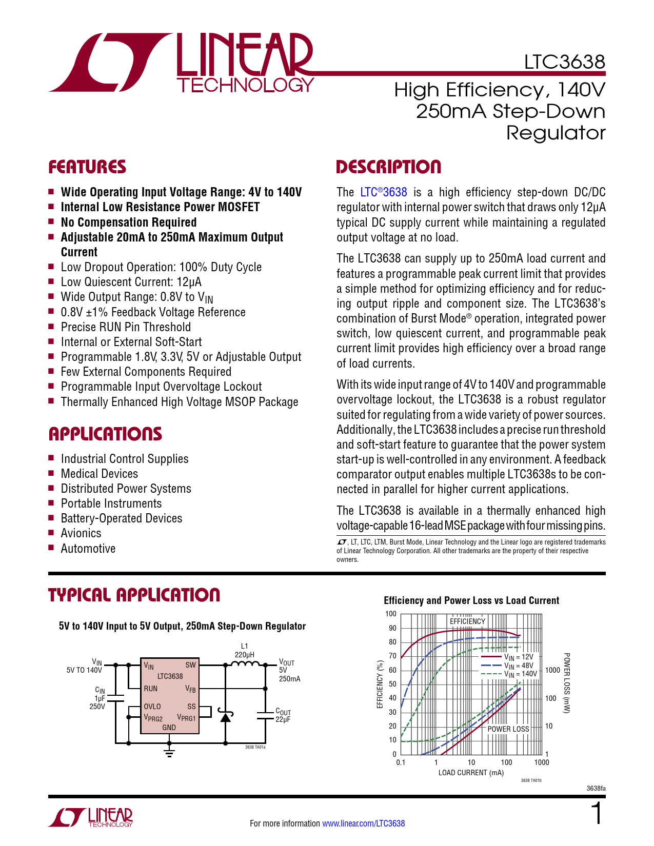 LTC3638 High Efficiency, 140V 250mA Step-Down Regulator FEATURESDESCRIPTION n Wide Operating Input Voltage Range: 4V to 140V The LTC®3638 is a high efficiency step-down DC/DC n Internal Low Resistance Power MOSFET regulator with internal power switch that draws only 12μA n No Compensation Required typical DC supply current while maintaining a regulated n Adjustable 20mA to 250mA Maximum Output output voltage at no load. Current The LTC3638 can supply up to 250mA load current and n Low Dropout Operation: 100% Duty Cycle features a programmable peak current limit that provides n Low Quiescent Current: 12µA a simple method for optimizing efficiency and for reduc- n Wide Output Range: 0.8V to VIN ing output ripple and component size. The LTC3638’s n 0.8V ±1% Feedback Voltage Reference combination of Burst Mode® operation, integrated power n Precise RUN Pin Threshold switch, low quiescent current, and programmable peak n Internal or External Soft-Start current limit provides high efficiency over a broad range n Programmable 1.8V, 3.3V, 5V or Adjustable Output of load currents. n Few External Components Required n Programmable Input Overvoltage Lockout With its wide input range of 4V to 140V and programmable n Thermally Enhanced High Voltage MSOP Package overvoltage lockout, the LTC3638 is a robust regulator suited for regulating from a wide variety of power sources. Additionally, the LTC3638 includes a precise run threshold APPLICATIONS and soft-start feature to guarantee that the power system n Industrial Control Supplies start-up is well-controlled in any environment. A feedback n Medical Devices comparator output enables multiple LTC3638s to be con- n Distributed Power Systems nected in parallel for higher current applications. n Portable Instruments The LTC3638 is available in a thermally enhanced high n Battery-Operated Devices voltage-capable 16-lead MSE package with four missing pins. n Avionics L, LT, LTC, LTM, Burst Mode, Linear Technology and the Linear logo are registered trademarks n Automotive of Linear Technology Corporation. All other trademarks are the property of their respective owners. TYPICAL APPLICATIONEfficiency and Power Loss vs Load Current 100 5V to 140V Input to 5V Output, 250mA Step-Down Regulator EFFICIENCY 90 L1 80 220µH POWER LOSS (mW) 70 V V IN = 12V IN V V IN SW OUT V 5V TO 140V 5V IN = 48V 60 1000 LTC3638 V 250mA IN = 140V 50 C RUN V IN FB 1µF 40 100 250V OVLO SS EFFICIENCY (%) COUT 30 VPRG2 VPRG1 22µF GND 20 10 POWER LOSS 10 3638 TA01a 0 1 0.1 1 10 100 1000 LOAD CURRENT (mA) 3638 TA01b 3638fa For more information www.linear.com/LTC3638 1 Document Outline Features Applications Description Typical Application Absolute Maximum Ratings Pin Configuration Order Information Electrical Characteristics Typical Performance Characteristics Pin Functions Block Diagram Operation Applications Information Typical Applications Package Description Typical Application Related Parts