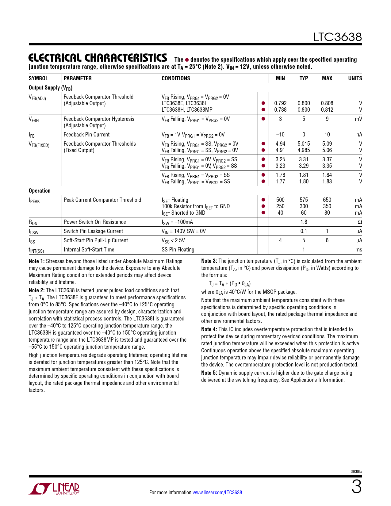 LTC3638 ELECTRICALCHARACTERISTICS The l denotes the specifications which apply over the specified operatingjunction temperature range, otherwise specifications are at TA = 25°C (Note 2). VIN = 12V, unless otherwise noted. SYMBOLPARAMETERCONDITIONSMINTYPMAXUNITSOutput Supply (VFB) VFB(ADJ) Feedback Comparator Threshold VFB Rising, VPRG1 = VPRG2 = 0V (Adjustable Output) LTC3638E, LTC3638I l 0.792 0.800 0.808 V LTC3638H, LTC3638MP l 0.788 0.800 0.812 V VFBH Feedback Comparator Hysteresis VFB Falling, VPRG1 = VPRG2 = 0V l 3 5 9 mV (Adjustable Output) IFB Feedback Pin Current VFB = 1V, VPRG1 = VPRG2 = 0V –10 0 10 nA VFB(FIXED) Feedback Comparator Thresholds VFB Rising, VPRG1 = SS, VPRG2 = 0V l 4.94 5.015 5.09 V (Fixed Output) VFB Falling, VPRG1 = SS, VPRG2 = 0V l 4.91 4.985 5.06 V VFB Rising, VPRG1 = 0V, VPRG2 = SS l 3.25 3.31 3.37 V VFB Falling, VPRG1 = 0V, VPRG2 = SS l 3.23 3.29 3.35 V VFB Rising, VPRG1 = VPRG2 = SS l 1.78 1.81 1.84 V VFB Falling, VPRG1 = VPRG2 = SS l 1.77 1.80 1.83 V Operation IPEAK Peak Current Comparator Threshold ISET Floating l 500 575 650 mA 100k Resistor from ISET to GND l 250 300 350 mA ISET Shorted to GND l 40 60 80 mA RON Power Switch On-Resistance ISW = –100mA 1.8 Ω ILSW Switch Pin Leakage Current VIN = 140V, SW = 0V 0.1 1 μA ISS Soft-Start Pin Pull-Up Current VSS < 2.5V 4 5 6 μA tINT(SS) Internal Soft-Start Time SS Pin Floating 1 ms Note 1: Stresses beyond those listed under Absolute Maximum Ratings Note 3: The junction temperature (TJ, in °C) is calculated from the ambient may cause permanent damage to the device. Exposure to any Absolute temperature (TA, in °C) and power dissipation (PD, in Watts) according to Maximum Rating condition for extended periods may affect device the formula: reliability and lifetime. TJ = TA + (PD • θJA) Note 2: The LTC3638 is tested under pulsed load conditions such that where θJA is 40°C/W for the MSOP package. TJ ≈ TA. The LTC3638E is guaranteed to meet performance specifications Note that the maximum ambient temperature consistent with these from 0°C to 85°C. Specifications over the –40°C to 125°C operating specifications is determined by specific operating conditions in junction temperature range are assured by design, characterization and conjunction with board layout, the rated package thermal impedance and correlation with statistical process controls. The LTC3638I is guaranteed other environmental factors. over the –40°C to 125°C operating junction temperature range, the LTC3638H is guaranteed over the –40°C to 150°C operating junction Note 4: This IC includes overtemperature protection that is intended to temperature range and the LTC3638MP is tested and guaranteed over the protect the device during momentary overload conditions. The maximum –55°C to 150°C operating junction temperature range. rated junction temperature will be exceeded when this protection is active. Continuous operation above the specified absolute maximum operating High junction temperatures degrade operating lifetimes; operating lifetime junction temperature may impair device reliability or permanently damage is derated for junction temperatures greater than 125°C. Note that the the device. The overtemperature protection level is not production tested. maximum ambient temperature consistent with these specifications is determined by specific operating conditions in conjunction with board Note 5: Dynamic supply current is higher due to the gate charge being layout, the rated package thermal impedance and other environmental delivered at the switching frequency. See Applications Information. factors. 3638fa For more information www.linear.com/LTC3638 3 Document Outline Features Applications Description Typical Application Absolute Maximum Ratings Pin Configuration Order Information Electrical Characteristics Typical Performance Characteristics Pin Functions Block Diagram Operation Applications Information Typical Applications Package Description Typical Application Related Parts