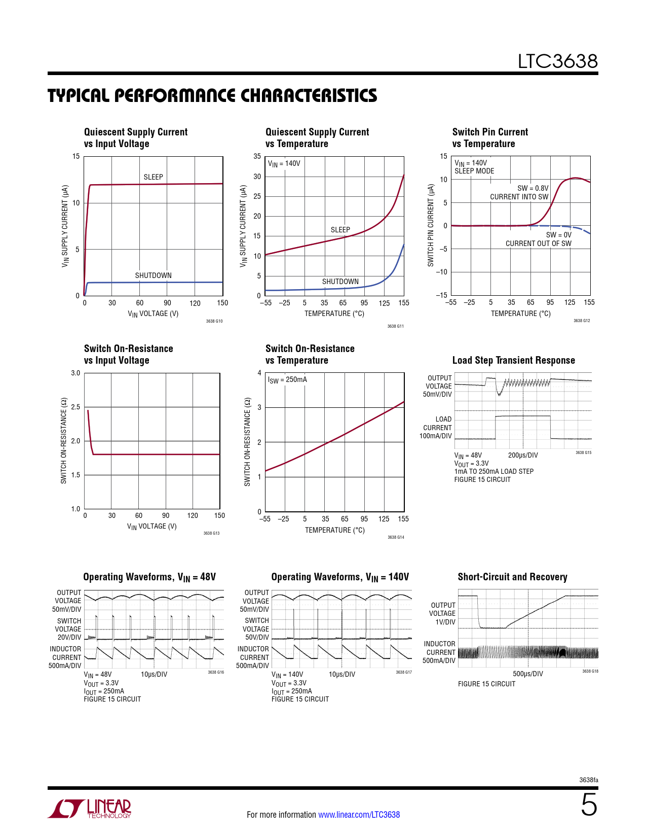 15 35 15 VIN = 140V VIN = 140V SLEEP MODE SLEEP 30 10 SW = 0.8V 25 CURRENT INTO SW 10 5 20 SLEEP 0 15 SW = 0V CURRENT OUT OF SW 5 –5 SUPPLY CURRENT (µA) SUPPLY CURRENT (µA) 10 V IN V IN SWITCH PIN CURRENT (µA) SHUTDOWN 5 –10 SHUTDOWN 0 0 –15 0 30 60 90 120 150 –55 –25 5 35 65 95 125 155 –55 –25 5 35 65 95 125 155 VIN VOLTAGE (V) TEMPERATURE (°C) TEMPERATURE (°C) 3638 G10 3638 G12 3638 G11