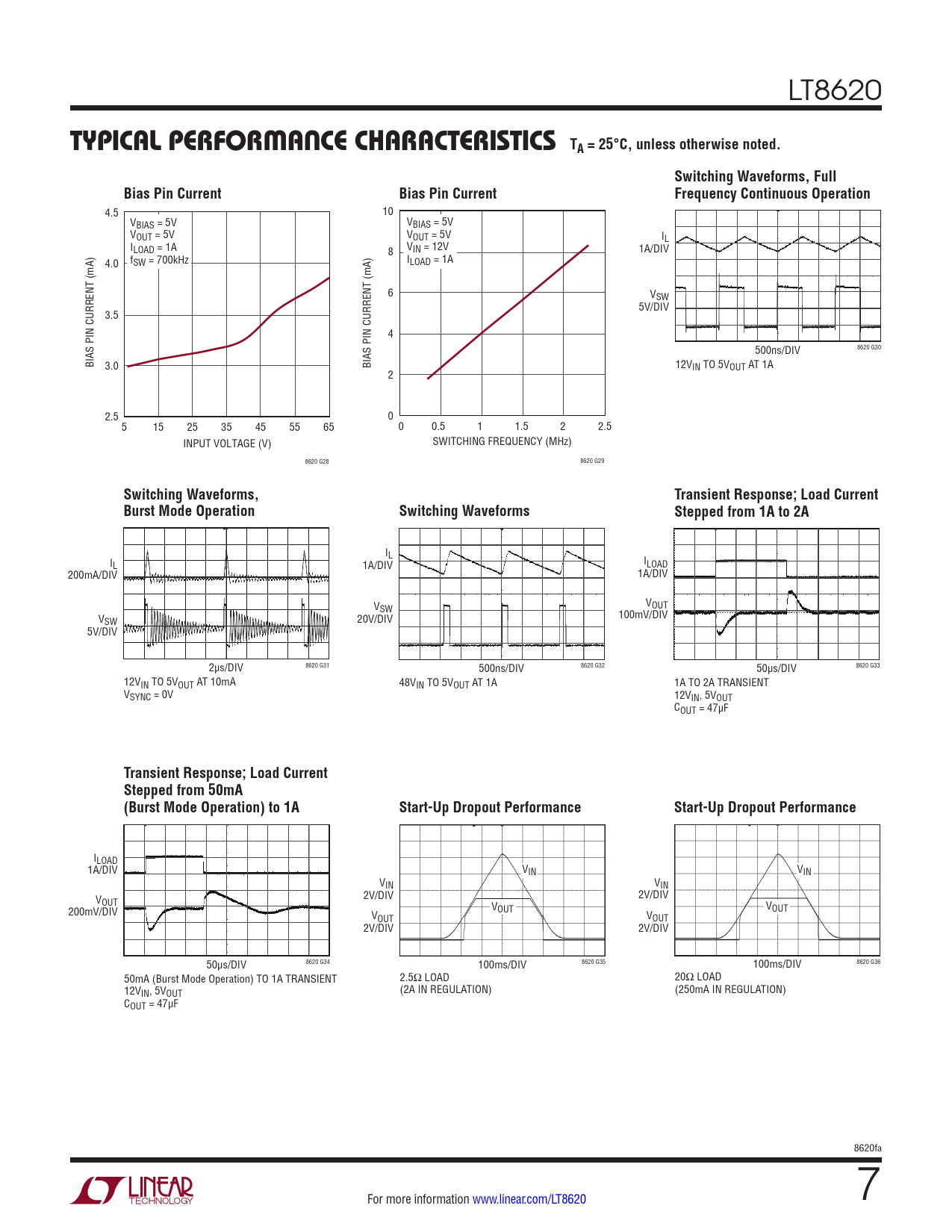 4.5 10 VBIAS = 5V VBIAS = 5V VOUT = 5V VOUT = 5V IL ILOAD = 1A 8 VIN = 12V 1A/DIV 4.0 fSW = 700kHz ILOAD = 1A 6 VSW 5V/DIV 3.5 4 500ns/DIV 8620 G30 BIAS PIN CURRENT (mA) 3.0 BIAS PIN CURRENT (mA) 12VIN TO 5VOUT AT 1A 2 2.5 0 5 15 25 35 45 55 65 0 0.5 1 1.5 2 2.5 INPUT VOLTAGE (V) SWITCHING FREQUENCY (MHz) 8620 G28 8620 G29