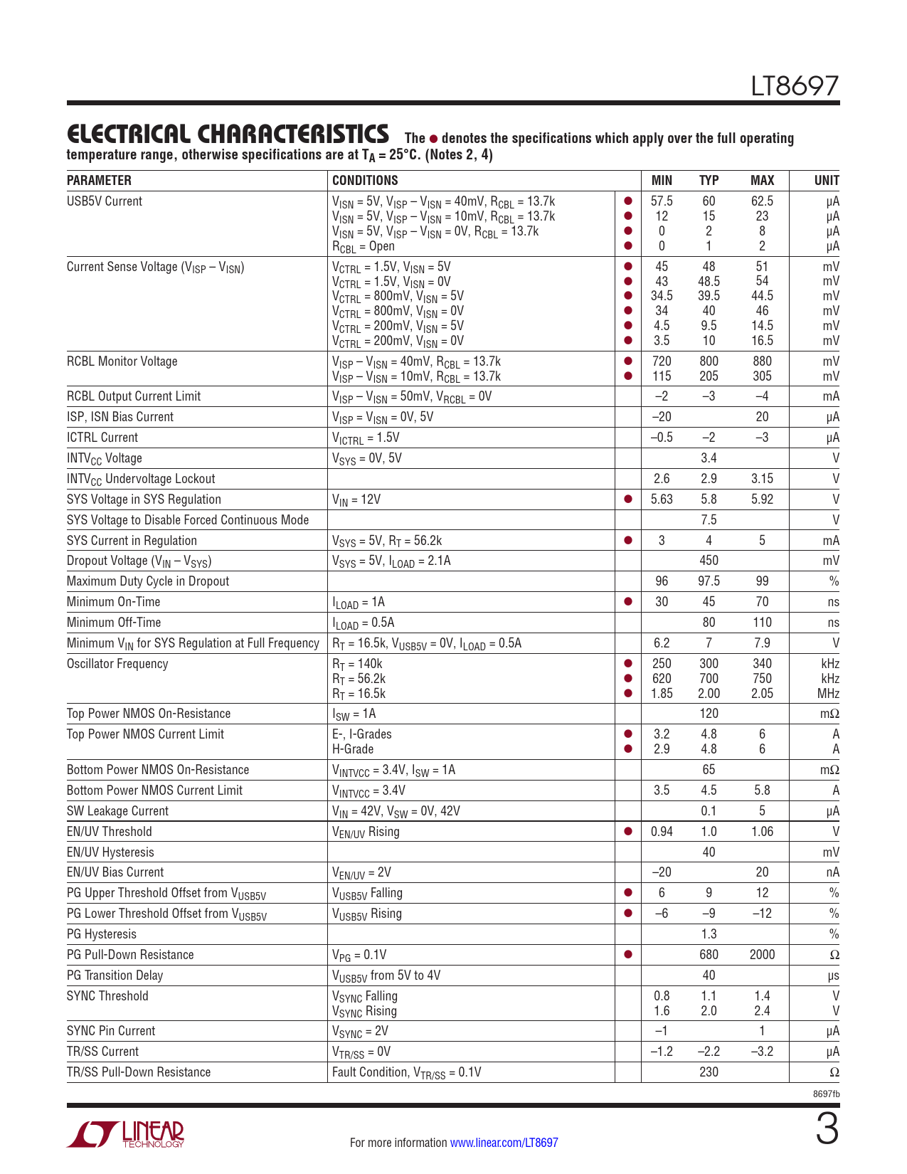 USB5V Current VISN = 5V, VISP – VISN = 40mV, RCBL = 13.7k l 57.5 60 62.5 µA VISN = 5V, VISP – VISN = 10mV, RCBL = 13.7k l 12 15 23 µA VISN = 5V, VISP – VISN = 0V, RCBL = 13.7k l 0 2 8 µA RCBL = Open l 0 1 2 µA Current Sense Voltage (VISP – VISN) VCTRL = 1.5V, VISN = 5V l 45 48 51 mV VCTRL = 1.5V, VISN = 0V l 43 48.5 54 mV VCTRL = 800mV, VISN = 5V l 34.5 39.5 44.5 mV VCTRL = 800mV, VISN = 0V l 34 40 46 mV VCTRL = 200mV, VISN = 5V l 4.5 9.5 14.5 mV VCTRL = 200mV, VISN = 0V l 3.5 10 16.5 mV RCBL Monitor Voltage VISP – VISN = 40mV, RCBL = 13.7k l 720 800 880 mV VISP – VISN = 10mV, RCBL = 13.7k l 115 205 305 mV RCBL Output Current Limit VISP – VISN = 50mV, VRCBL = 0V –2 –3 –4 mA ISP, ISN Bias Current VISP = VISN = 0V, 5V –20 20 µA ICTRL Current VICTRL = 1.5V –0.5 –2 –3 µA INTVCC Voltage VSYS = 0V, 5V 3.4 V INTVCC Undervoltage Lockout 2.6 2.9 3.15 V SYS Voltage in SYS Regulation VIN = 12V l 5.63 5.8 5.92 V SYS Voltage to Disable Forced Continuous Mode 7.5 V SYS Current in Regulation VSYS = 5V, RT = 56.2k l 3 4 5 mA Dropout Voltage (VIN – VSYS) VSYS = 5V, ILOAD = 2.1A 450 mV Maximum Duty Cycle in Dropout 96 97.5 99 % Minimum On-Time ILOAD = 1A l 30 45 70 ns Minimum Off-Time ILOAD = 0.5A 80 110 ns Minimum VIN for SYS Regulation at Full Frequency RT = 16.5k, VUSB5V = 0V, ILOAD = 0.5A 6.2 7 7.9 V Oscillator Frequency RT = 140k l 250 300 340 kHz RT = 56.2k l 620 700 750 kHz RT = 16.5k l 1.85 2.00 2.05 MHz Top Power NMOS On-Resistance ISW = 1A 120 mΩ Top Power NMOS Current Limit E-, I-Grades l 3.2 4.8 6 A H-Grade l 2.9 4.8 6 A Bottom Power NMOS On-Resistance VINTVCC = 3.4V, ISW = 1A 65 mΩ Bottom Power NMOS Current Limit VINTVCC = 3.4V 3.5 4.5 5.8 A SW Leakage Current VIN = 42V, VSW = 0V, 42V 0.1 5 µA EN/UV Threshold VEN/UV Rising l 0.94 1.0 1.06 V EN/UV Hysteresis 40 mV EN/UV Bias Current VEN/UV = 2V –20 20 nA PG Upper Threshold Offset from VUSB5V VUSB5V Falling l 6 9 12 % PG Lower Threshold Offset from VUSB5V VUSB5V Rising l –6 –9 –12 % PG Hysteresis 1.3 % PG Pull-Down Resistance VPG = 0.1V l 680 2000 Ω PG Transition Delay VUSB5V from 5V to 4V 40 µs SYNC Threshold VSYNC Falling 0.8 1.1 1.4 V VSYNC Rising 1.6 2.0 2.4 V SYNC Pin Current VSYNC = 2V –1 1 µA TR/SS Current VTR/SS = 0V –1.2 –2.2 –3.2 µA TR/SS Pull-Down Resistance Fault Condition, VTR/SS = 0.1V 230 Ω 8697fb For more information www.linear.com/LT8697 3 Document Outline Features Applications Typical Application Absolute Maximum Ratings Order Information Electrical Characteristics Typical Performance Characteristics Pin Functions Block Diagram Operation Applications Information Typical Applications Package Description Revision History Typical Application Related Parts