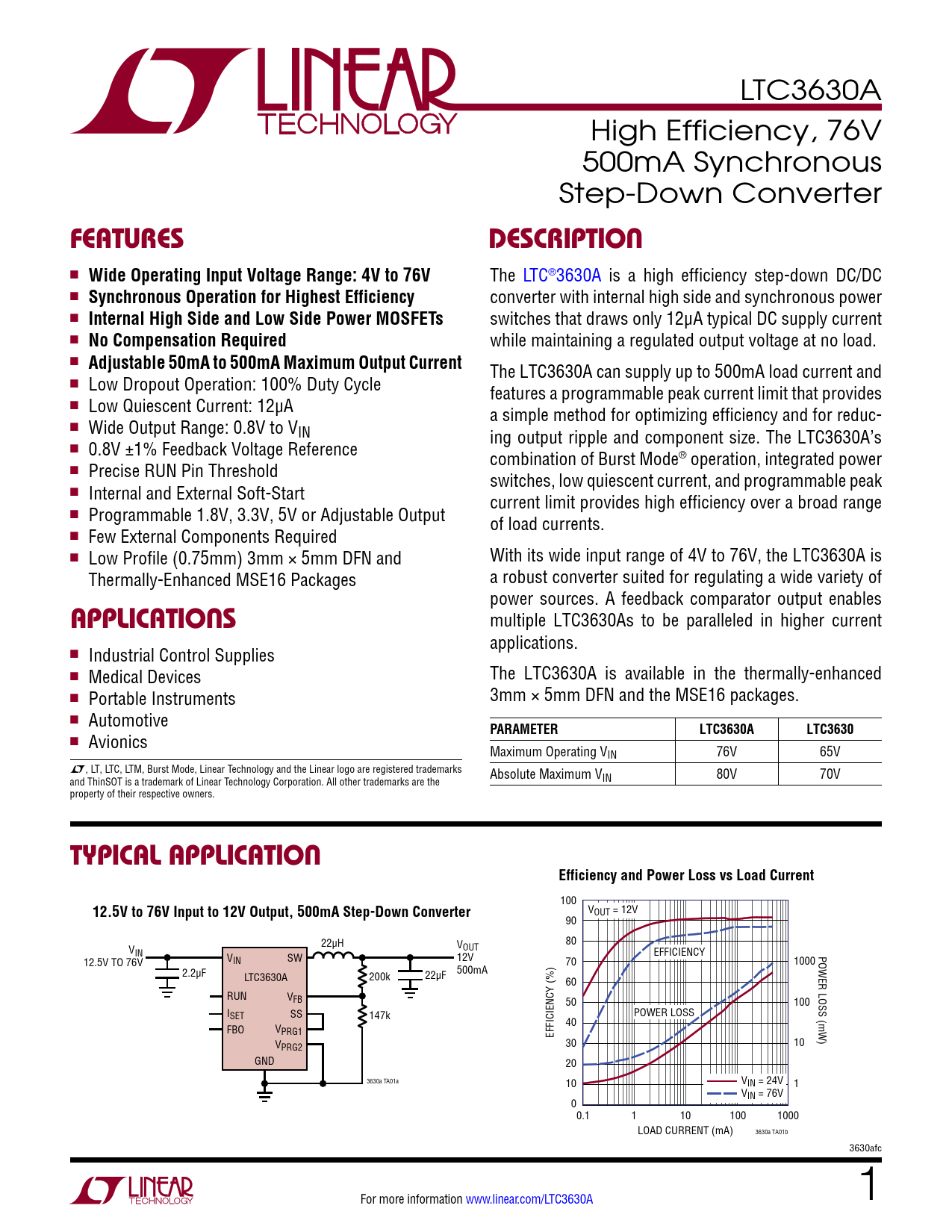 LTC3630A High Efficiency, 76V 500mA Synchronous Step-Down Converter FeaTuresDescripTion n Wide Operating Input Voltage Range: 4V to 76V The LTC®3630A is a high efficiency step-down DC/DC n Synchronous Operation for Highest Efficiency converter with internal high side and synchronous power n Internal High Side and Low Side Power MOSFETs switches that draws only 12μA typical DC supply current n No Compensation Required while maintaining a regulated output voltage at no load. n Adjustable 50mA to 500mA Maximum Output Current The LTC3630A can supply up to 500mA load current and n Low Dropout Operation: 100% Duty Cycle features a programmable peak current limit that provides n Low Quiescent Current: 12µA a simple method for optimizing efficiency and for reduc- n Wide Output Range: 0.8V to VIN ing output ripple and component size. The LTC3630A’s n 0.8V ±1% Feedback Voltage Reference combination of Burst Mode® operation, integrated power n Precise RUN Pin Threshold switches, low quiescent current, and programmable peak n Internal and External Soft-Start current limit provides high efficiency over a broad range n Programmable 1.8V, 3.3V, 5V or Adjustable Output of load currents. n Few External Components Required n Low Profile (0.75mm) 3mm × 5mm DFN and With its wide input range of 4V to 76V, the LTC3630A is Thermally-Enhanced MSE16 Packages a robust converter suited for regulating a wide variety of power sources. A feedback comparator output enables applicaTions multiple LTC3630As to be paralleled in higher current applications. n Industrial Control Supplies n Medical Devices The LTC3630A is available in the thermally-enhanced n Portable Instruments 3mm × 5mm DFN and the MSE16 packages. n Automotive PARAMETERLTC3630ALTC3630 n Avionics Maximum Operating VIN 76V 65V L, LT, LTC, LTM, Burst Mode, Linear Technology and the Linear logo are registered trademarks Absolute Maximum VIN 80V 70V and ThinSOT is a trademark of Linear Technology Corporation. All other trademarks are the property of their respective owners. Typical applicaTionEfficiency and Power Loss vs Load Current 100 12.5V to 76V Input to 12V Output, 500mA Step-Down Converter VOUT = 12V 90 22µH V 80 OUT VIN V EFFICIENCY POWER LOSS (mW) IN SW 12V 12.5V TO 76V 70 1000 2.2µF LTC3630A 22µF 500mA 200k 60 RUN VFB 50 100 ISET SS 147k POWER LOSS 40 FBO VPRG1 EFFICIENCY (%) VPRG2 30 10 GND 20 3630a TA01a 10 VIN = 24V 1 VIN = 76V 00.1 1 10 100 1000 LOAD CURRENT (mA) 3630a TA01b 3630afc For more information www.linear.com/LTC3630A 1 Document Outline Features Applications Description Typical Application Absolute Maximum Ratings Pin Configuration Order Information Electrical Characteristics Typical Performance Characteristics Pin Functions Block Diagram Operation Applications Information Typical Applications Package Description Revision History Typical Application Related Parts