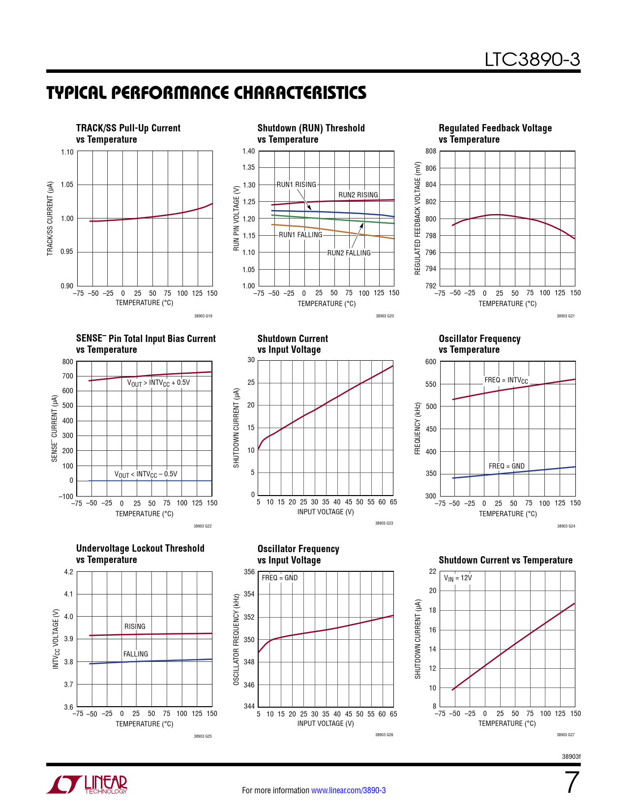 800 30 600 700 VOUT > INTVCC + 0.5V 25 550 FREQ = INTVCC 600 500 20 500 400 15 450 300 – CURRENT (µA) 200 10 FREQUENCY (kHz) 400 SENSE 100 SHUTDOWN CURRENT (µA) FREQ = GND V 5 OUT < INTVCC – 0.5V 350 0 0 –100 300 –75 –50 –25 0 25 50 75 100 125 150 5 10 15 20 25 30 35 40 45 50 55 60 65 –75 –50 –25 0 25 50 75 100 125 150 INPUT VOLTAGE (V) TEMPERATURE (°C) TEMPERATURE (°C) 38903 G23 38903 G22 38903 G24