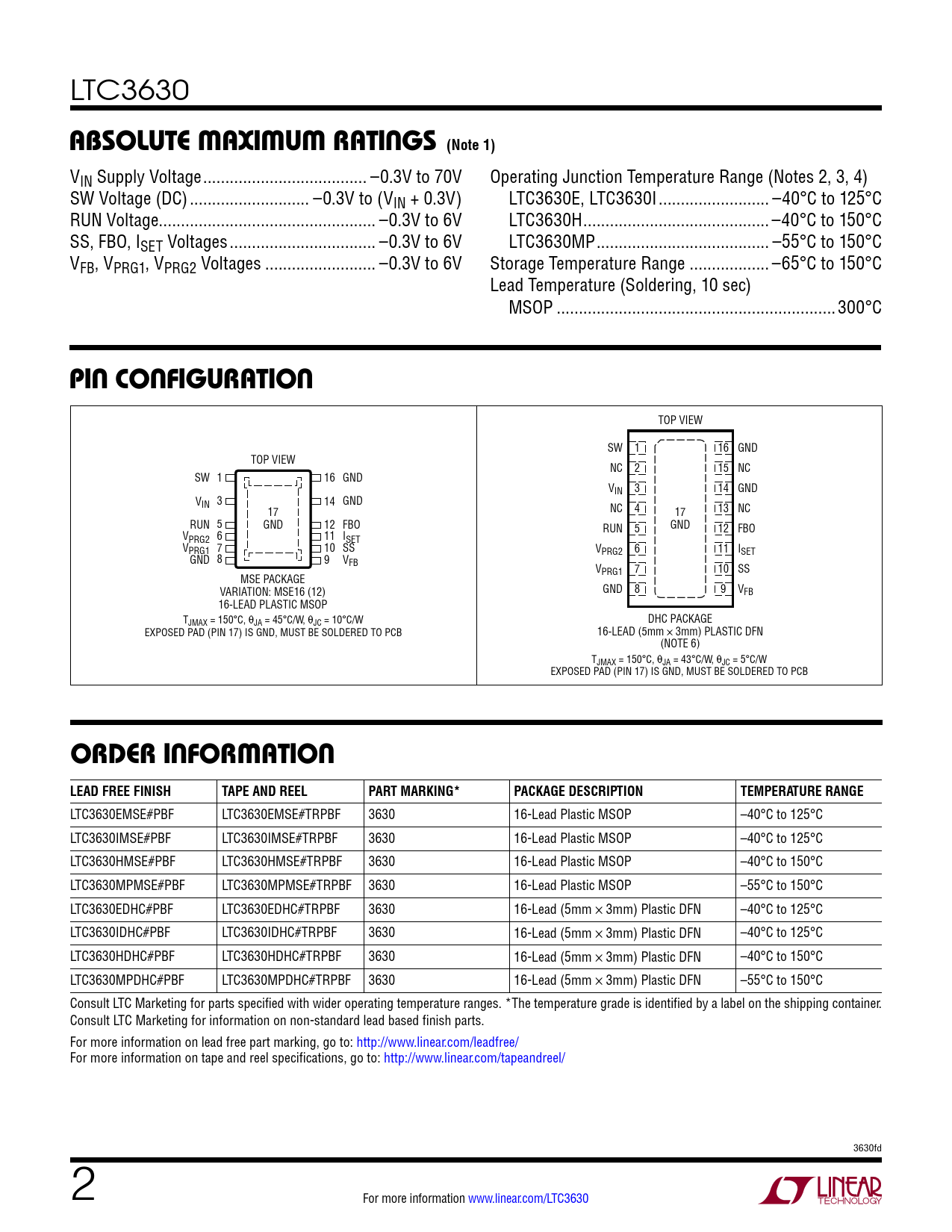 LTC3630EMSE#PBF LTC3630EMSE#TRPBF 3630 16-Lead Plastic MSOP –40°C to 125°C LTC3630IMSE#PBF LTC3630IMSE#TRPBF 3630 16-Lead Plastic MSOP –40°C to 125°C LTC3630HMSE#PBF LTC3630HMSE#TRPBF 3630 16-Lead Plastic MSOP –40°C to 150°C LTC3630MPMSE#PBF LTC3630MPMSE#TRPBF 3630 16-Lead Plastic MSOP –55°C to 150°C LTC3630EDHC#PBF LTC3630EDHC#TRPBF 3630 16-Lead (5mm × 3mm) Plastic DFN –40°C to 125°C LTC3630IDHC#PBF LTC3630IDHC#TRPBF 3630 16-Lead (5mm × 3mm) Plastic DFN –40°C to 125°C LTC3630HDHC#PBF LTC3630HDHC#TRPBF 3630 16-Lead (5mm × 3mm) Plastic DFN –40°C to 150°C LTC3630MPDHC#PBF LTC3630MPDHC#TRPBF 3630 16-Lead (5mm × 3mm) Plastic DFN –55°C to 150°C Consult LTC Marketing for parts specified with wider operating temperature ranges. *The temperature grade is identified by a label on the shipping container. Consult LTC Marketing for information on non-standard lead based finish parts. For more information on lead free part marking, go to: http://www.linear.com/leadfree/ For more information on tape and reel specifications, go to: http://www.linear.com/tapeandreel/ 3630fd 2 For more information www.linear.com/LTC3630 Document Outline Features Applications Description Typical Application Absolute Maximum Ratings Pin Configuration Order Information Electrical Characteristics Typical Performance Characteristics Pin Functions Block Diagram Operation Applications Information Typical Applications Package Description Typical Application Related Parts