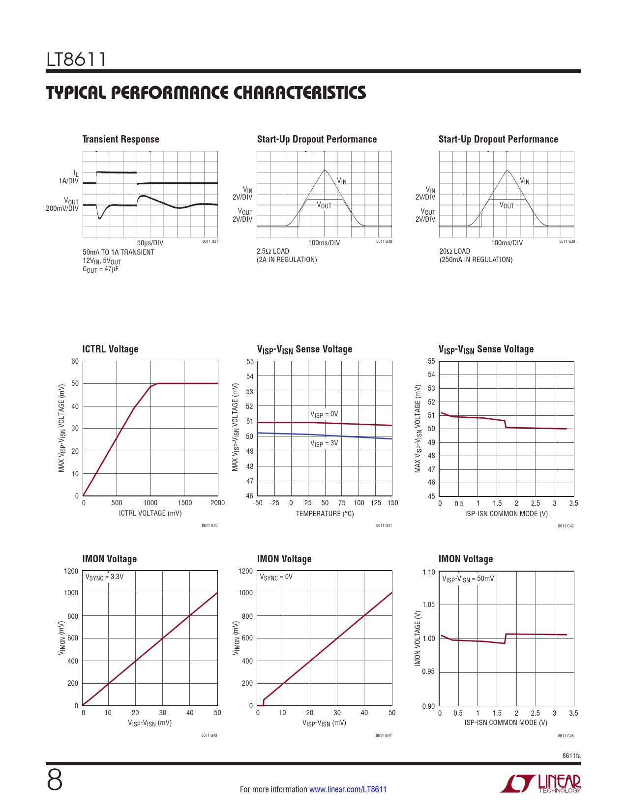 60 55 55 54 54 50 53 53 52 40 52 VISP = 0V 51 VOLTAGE (mV) 30 VOLTAGE (mV) 51 VOLTAGE (mV) 50 ISN ISN 50 ISN -V -V VISP = 3V -V 49 ISP 20 ISP 49 ISP 48 MAX V MAX V 48 10 MAX V 47 47 46 0 46 45 0 500 1000 1500 2000 –50 –25 0 25 50 75 100 125 150 0 0.5 1 1.5 2 2.5 3 3.5 ICTRL VOLTAGE (mV) TEMPERATURE (°C) ISP-ISN COMMON MODE (V) 8611 G40 8611 G41 8611 G42
