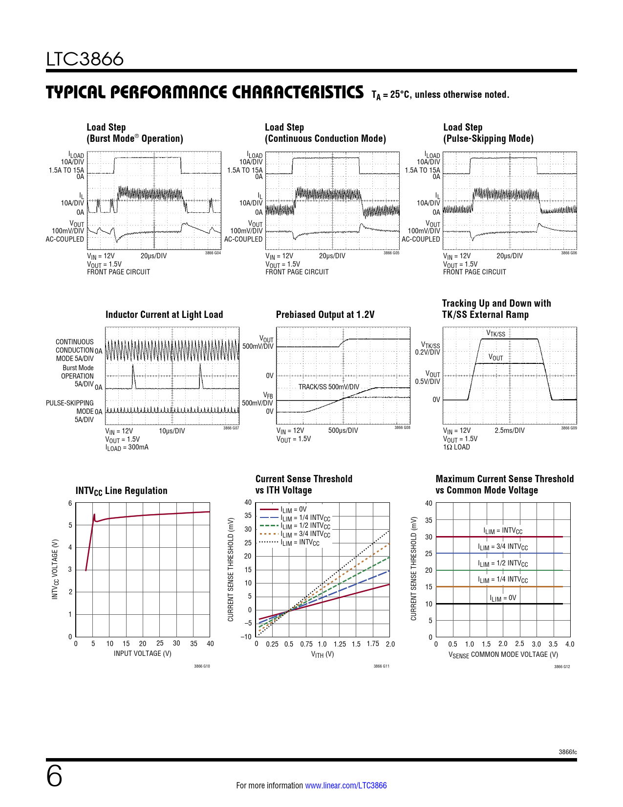 6 40 40 ILIM = 0V 35 ILIM = 1/4 INTVCC 35 5 30 ILIM = 1/2 INTVCC I I LIM = 3/4 INTVCC LIM = INTVCC 30 I 4 25 LIM = INTVCC ILIM = 3/4 INTVCC 20 25 ILIM = 1/2 INTVCC 3 15 20 VOLTAGE (V) I CC 10 LIM = 1/4 INTVCC 15 2 INTV 5 I 10 LIM = 0V 0 1 CURRENT SENSE THRESHOLD (mV) CURRENT SENSE THRESHOLD (mV) –5 5 0 –10 0 0 5 10 15 20 25 30 35 40 0 0.25 0.5 0.75 1.0 1.25 1.5 1.75 2.0 0 0.5 1.0 1.5 2.0 2.5 3.0 3.5 4.0 INPUT VOLTAGE (V) VITH (V) VSENSE COMMON MODE VOLTAGE (V) 3866 G10 3866 G11 3866 G12 3866fc 6 For more information www.linear.com/LTC3866 Document Outline Features Applications Description Typical Application Absolute Maximum Ratings Pin Configuration Order Information Electrical Characteristics Typical Performance Characteristics Pin Functions Functional Block Diagram Operation Applications Information Typical Applications Package Description Revision History Typical Application Related Parts
