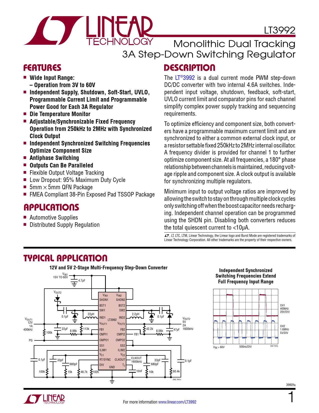 LT3992 Monolithic Dual Tracking 3A Step-Down Switching Regulator FeaTuresDescripTion n Wide Input Range: The LT®3992 is a dual current mode PWM step-down – Operation from 3V to 60V DC/DC converter with two internal 4.6A switches. Inde- n Independent Supply, Shutdown, Soft-Start, UVLO, pendent input voltage, shutdown, feedback, soft-start, Programmable Current Limit and Programmable UVLO current limit and comparator pins for each channel Power Good for Each 3A Regulator simplify complex power supply tracking and sequencing n Die Temperature Monitor requirements. n Adjustable/Synchronizable Fixed Frequency To optimize efficiency and component size, both convert- Operation from 250kHz to 2MHz with Synchronized ers have a programmable maximum current limit and are Clock Output synchronized to either a common external clock input, or n Independent Synchronized Switching Frequencies a resistor settable fixed 250kHz to 2MHz internal oscillator. Optimize Component Size A frequency divider is provided for channel 1 to further n Antiphase Switching optimize component size. At all frequencies, a 180° phase n Outputs Can Be Paralleled relationship between channels is maintained, reducing volt- n Flexible Output Voltage Tracking age ripple and component size. A clock output is available n Low Dropout: 95% Maximum Duty Cycle for synchronizing multiple regulators. n 5mm × 5mm QFN Package n Minimum input to output voltage ratios are improved by FMEA Compliant 38-Pin Exposed Pad TSSOP Package allowing the switch to stay on through multiple clock cycles applicaTions only switching off when the boost capacitor needs recharg- ing. Independent channel operation can be programmed n Automotive Supplies using the SHDN pin. Disabling both converters reduces n Distributed Supply Regulation the total quiescent current to <10µA. L, LT, LTC, LTM, Linear Technology, the Linear logo and Burst Mode are registered trademarks of Linear Technology Corporation. All other trademarks are the property of their respective owners. Typical applicaTion12V and 5V 2-Stage Multi-Frequency Step-Down ConverterIndependent Synchronized VIN1 15V TO 60V Switching Frequencies Extend 4.7µF Full Frequency Input Range VOUT2 VIN1 VIN2 SHDN1 SHDN2 BST1 BST2 CH1 SW1 SW2 400kHz 20V/DIV 22µH 2.2µH 0.1µF IND1 IND2 0.1µF VOUT1 LT3992 VOUT2 12V V 5V OUT1 VOUT2 1A 2A CH2 400kHz 22µF FB1 FB2 42.2k 47µF 1600kHz 1.6MHz 100k 8.06k 113k 8.06k CMPI1 CMPI2 FB1 5V/DIV PG CMPO1 CMPO2 SS1 SS2 VIN = 60V 500ns/DIV 3992 TA01b ILIM1 ILIM2 VC1 VC2 0.1µF CLKOUT 33pF RT/SYNC CLKOUT 33pF 1600kHz 0.1µF 680pF DIV TJ 680pF GND 100k 15k 48.7k 102k 10nF 10k 60.4k 3992 TA01a 3992fa For more information www.linear.com/LT3992 1 Document Outline Features Applications Description Typical Application Absolute Maximum Ratings Pin Configuration Order Information Electrical Characteristics Typical Performance Characteristics Pin Functions Block Diagram Applications Information Typical Applications Package Description Typical Application Related Parts