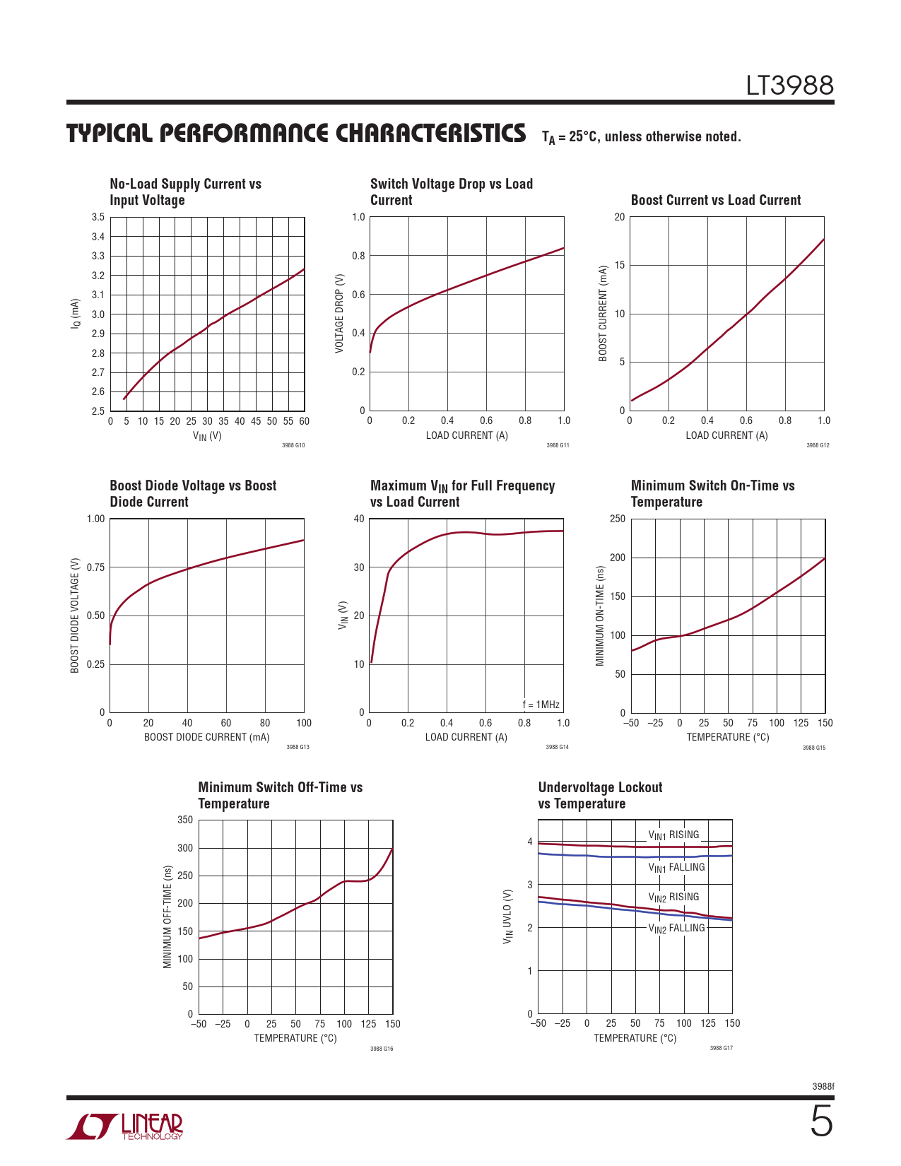 1.00 40 250 200 0.75 30 150 0.50 (V) 20 V IN 100 MINIMUM ON-TIME (ns) BOOST DIODE VOLTAGE (V) 0.25 10 50 f = 1MHz 0 0 0 0 20 40 60 80 100 0 0.2 0.4 0.6 0.8 1.0 –50 –25 0 25 50 75 100 125 150 BOOST DIODE CURRENT (mA) LOAD CURRENT (A) TEMPERATURE (°C) 3988 G13 3988 G14 3988 G15