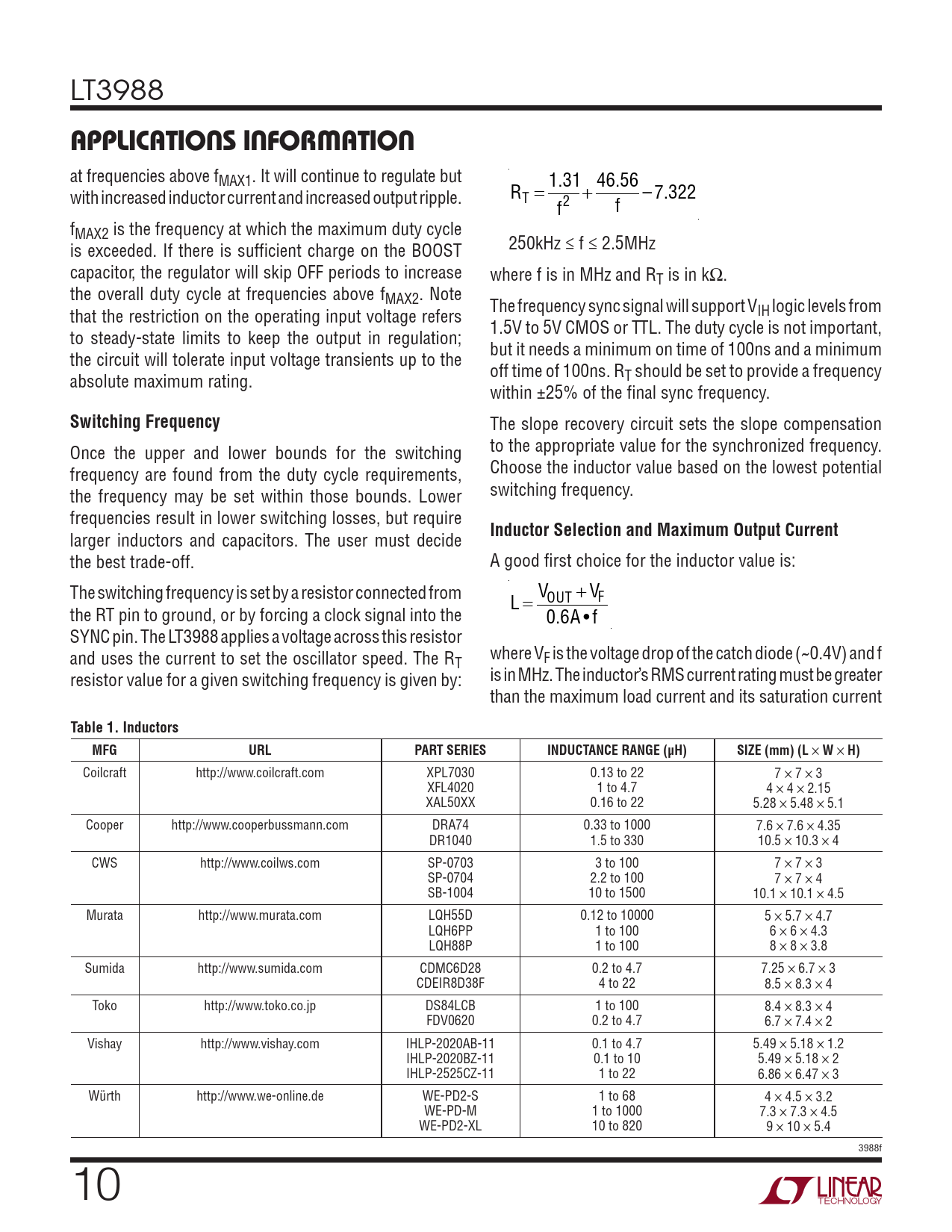 applicaTions inForMaTion. Switching Frequency. Inductor Selection and Maximum Output Current. Table 1. Inductors. MFG. URL