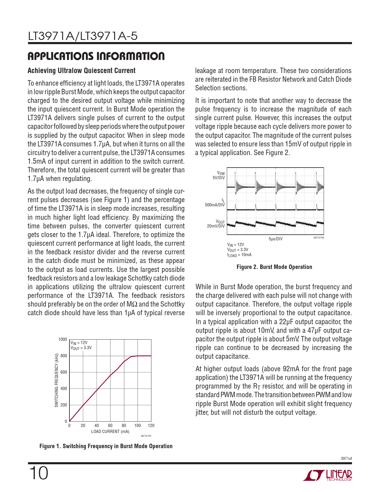 LT3971A/LT3971A-5 APPLICATIONS INFORMATIONAchieving Ultralow Quiescent Current leakage at room temperature. These two considerations are reiterated in the FB Resistor Network and Catch Diode To enhance efficiency at light loads, the LT3971A operates Selection sections. in low ripple Burst Mode, which keeps the output capacitor charged to the desired output voltage while minimizing It is important to note that another way to decrease the the input quiescent current. In Burst Mode operation the pulse frequency is to increase the magnitude of each LT3971A delivers single pulses of current to the output single current pulse. However, this increases the output capacitor followed by sleep periods where the output power voltage ripple because each cycle delivers more power to is supplied by the output capacitor. When in sleep mode the output capacitor. The magnitude of the current pulses the LT3971A consumes 1.7μA, but when it turns on all the was selected to ensure less than 15mV of output ripple in circuitry to deliver a current pulse, the LT3971A consumes a typical application. See Figure 2. 1.5mA of input current in addition to the switch current. Therefore, the total quiescent current will be greater than VSW 1.7μA when regulating. 5V/DIV As the output load decreases, the frequency of single cur- rent pulses decreases (see Figure 1) and the percentage IL 500mA/DIV of time the LT3971A is in sleep mode increases, resulting in much higher light load efficiency. By maximizing the VOUT time between pulses, the converter quiescent current 20mV/DIV gets closer to the 1.7μA ideal. Therefore, to optimize the 5μs/DIV 3971A F02 quiescent current performance at light loads, the current VIN = 12V in the feedback resistor divider and the reverse current VOUT = 3.3V ILOAD = 10mA in the catch diode must be minimized, as these appear to the output as load currents. Use the largest possible Figure 2. Burst Mode Operation feedback resistors and a low leakage Schottky catch diode in applications utilizing the ultralow quiescent current While in Burst Mode operation, the burst frequency and performance of the LT3971A. The feedback resistors the charge delivered with each pulse will not change with should preferably be on the order of MΩ and the Schottky output capacitance. Therefore, the output voltage ripple catch diode should have less than 1μA of typical reverse will be inversely proportional to the output capacitance. In a typical application with a 22μF output capacitor, the output ripple is about 10mV, and with a 47μF output ca- 1000 pacitor the output ripple is about 5mV. The output voltage VIN = 12V VOUT = 3.3V ripple can continue to be decreased by increasing the 800 output capacitance. At higher output loads (above 92mA for the front page 600 application) the LT3971A will be running at the frequency programmed by the R 400 T resistor, and will be operating in standard PWM mode. The transition between PWM and low ripple Burst Mode operation will exhibit slight frequency SWITCHING FREQUENCY (kHz) 200 jitter, but will not disturb the output voltage. 0 0 20 40 60 80 100 120 LOAD CURRENT (mA) 3971A F01 Figure 1. Switching Frequency in Burst Mode Operation 3971af 10 Document Outline FEATURES DESCRIPTION APPLICATIONS TYPICAL APPLICATION ABSOLUTE MAXIMUM RATINGS PIN CONFIGURATION ORDER INFORMATION ELECTRICAL CHARACTERISTICS TYPICAL PERFORMANCE CHARACTERISTICS PIN FUNCTIONS BLOCK DIAGRAM OPERATION APPLICATIONS INFORMATION TYPICAL APPLICATIONS PACKAGE DESCRIPTION TYPICAL APPLICATION RELATED PARTS