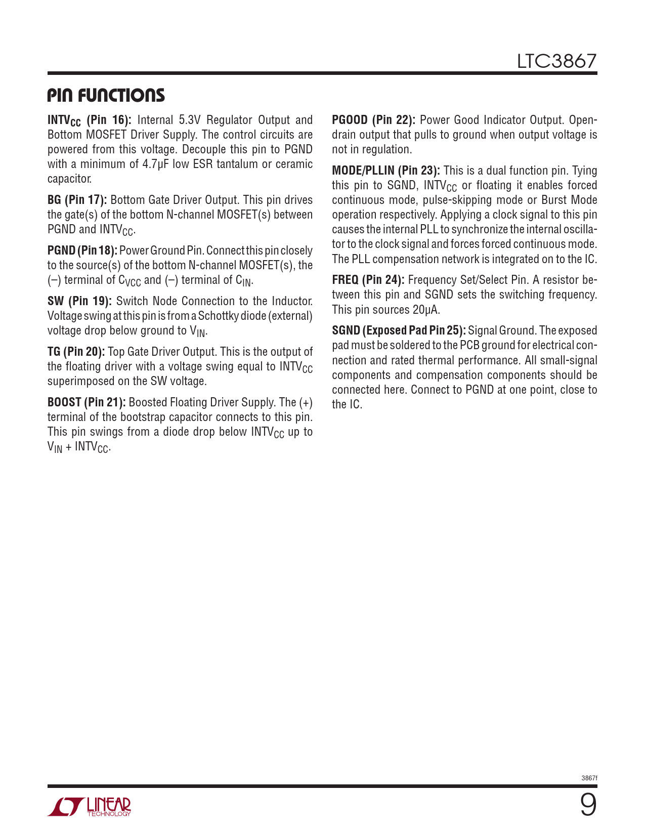 PIN FUNCTIONS. INTVCC. (Pin 16):. PGOOD. (Pin 22):. MODE/PLLIN. (Pin 23):. (Pin 17):. PGND. (Pin 18):. FREQ. (Pin 24):. (Pin 19):. SGND