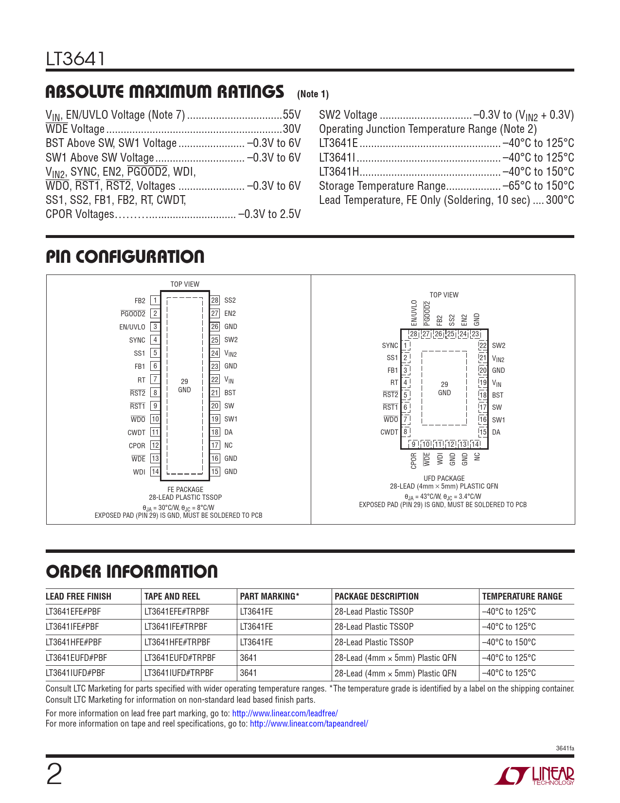 LT3641 ABSOLUTE MAXIMUM RATINGS (Note 1) VIN, EN/UVLO Voltage (Note 7) ...55V SW2 Voltage .. –0.3V to (VIN2 + 0.3V) WDE Voltage ...30V Operating Junction Temperature Range (Note 2) BST Above SW, SW1 Voltage ... –0.3V to 6V LT3641E ... –40°C to 125°C SW1 Above SW Voltage ... –0.3V to 6V LT3641I .. –40°C to 125°C VIN2, SYNC, EN2, PGOOD2, WDI, LT3641H ... –40°C to 150°C WDO, RST1, RST2, Voltages ... –0.3V to 6V Storage Temperature Range ... –65°C to 150°C SS1, SS2, FB1, FB2, RT, CWDT, Lead Temperature, FE Only (Soldering, 10 sec) .. 300°C CPOR Voltages………... ... –0.3V to 2.5V PIN CONFIGURATION TOP VIEW TOP VIEW FB2 1 28 SS2 PGOOD2 2 27 EN2 EN/UVLO PGOOD2 FB2 SS2 EN2 GND EN/UVLO 3 26 GND 28 27 26 25 24 23 SYNC 4 25 SW2 SYNC 1 22 SW2 SS1 5 24 VIN2 SS1 2 21 VIN2 FB1 6 23 GND FB1 3 20 GND RT 7 22 V 29 IN RT 4 19 V 29 IN RST2 8 GND 21 BST RST2 5 GND 18 BST RST1 9 20 SW RST1 6 17 SW WDO 10 19 SW1 WDO 7 16 SW1 CWDT 11 18 DA CWDT 8 15 DA CPOR 12 17 NC 9 10 11 12 13 14 WDE 13 16 GND NC WDE WDI GND GND CPOR WDI 14 15 GND UFD PACKAGE FE PACKAGE 28-LEAD (4mm × 5mm) PLASTIC QFN 28-LEAD PLASTIC TSSOP θJA = 43°C/W, θJC = 3.4°C/W θ EXPOSED PAD (PIN 29) IS GND, MUST BE SOLDERED TO PCB JA = 30°C/W, θJC = 8°C/W EXPOSED PAD (PIN 29) IS GND, MUST BE SOLDERED TO PCB ORDER INFORMATIONLEAD FREE FINISHTAPE AND REELPART MARKING*PACKAGE DESCRIPTIONTEMPERATURE RANGE LT3641EFE#PBF LT3641EFE#TRPBF LT3641FE 28-Lead Plastic TSSOP –40°C to 125°C LT3641IFE#PBF LT3641IFE#TRPBF LT3641FE 28-Lead Plastic TSSOP –40°C to 125°C LT3641HFE#PBF LT3641HFE#TRPBF LT3641FE 28-Lead Plastic TSSOP –40°C to 150°C LT3641EUFD#PBF LT3641EUFD#TRPBF 3641 28-Lead (4mm × 5mm) Plastic QFN –40°C to 125°C LT3641IUFD#PBF LT3641IUFD#TRPBF 3641 28-Lead (4mm × 5mm) Plastic QFN –40°C to 125°C Consult LTC Marketing for parts specifi ed with wider operating temperature ranges. *The temperature grade is identifi ed by a label on the shipping container. Consult LTC Marketing for information on non-standard lead based fi nish parts. For more information on lead free part marking, go to: http://www.linear.com/leadfree/ For more information on tape and reel specifi cations, go to: http://www.linear.com/tapeandreel/ 3641fa 2