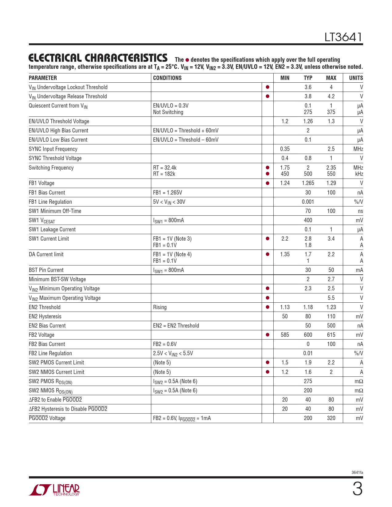 VIN Undervoltage Lockout Threshold l 3.6 4 V VIN Undervoltage Release Threshold l 3.8 4.2 V Quiescent Current from VIN EN/UVLO = 0.3V 0.1 1 μA Not Switching 275 375 μA EN/UVLO Threshold Voltage 1.2 1.26 1.3 V EN/UVLO High Bias Current EN/UVLO = Threshold + 60mV 2 μA EN/UVLO Low Bias Current EN/UVLO = Threshold – 60mV 0.1 μA SYNC Input Frequency 0.35 2.5 MHz SYNC Threshold Voltage 0.4 0.8 1 V Switching Frequency RT = 32.4k l 1.75 2 2.35 MHz RT = 182k l 450 500 550 kHz FB1 Voltage l 1.24 1.265 1.29 V FB1 Bias Current FB1 = 1.265V 30 100 nA FB1 Line Regulation 5V < VIN < 30V 0.001 %/V SW1 Minimum Off-Time 70 100 ns SW1 VCESAT ISW1 = 800mA 400 mV SW1 Leakage Current 0.1 1 μA SW1 Current Limit FB1 = 1V (Note 3) l 2.2 2.8 3.4 A FB1 = 0.1V 1.8 A DA Current limit FB1 = 1V (Note 4) l 1.35 1.7 2.2 A FB1 = 0.1V 1 A BST Pin Current ISW1 = 800mA 30 50 mA Minimum BST-SW Voltage 2 2.7 V VIN2 Minimum Operating Voltage l 2.3 2.5 V VIN2 Maximum Operating Voltage l 5.5 V EN2 Threshold Rising l 1.13 1.18 1.23 V EN2 Hysteresis 50 80 110 mV EN2 Bias Current EN2 = EN2 Threshold 50 500 nA FB2 Voltage l 585 600 615 mV FB2 Bias Current FB2 = 0.6V 0 100 nA FB2 Line Regulation 2.5V < VIN2 < 5.5V 0.01 %/V SW2 PMOS Current Limit (Note 5) l 1.5 1.9 2.2 A SW2 NMOS Current Limit (Note 5) l 1.2 1.6 2 A SW2 PMOS RDS(ON) ISW2 = 0.5A (Note 6) 275 mΩ SW2 NMOS RDS(ON) ISW2 = 0.5A (Note 6) 200 mΩ ΔFB2 to Enable PGOOD2 20 40 80 mV ΔFB2 Hysteresis to Disable PGOOD2 20 40 80 mV PGOOD2 Voltage FB2 = 0.6V, IPGOOD2 = 1mA 200 320 mV 3641fa 3