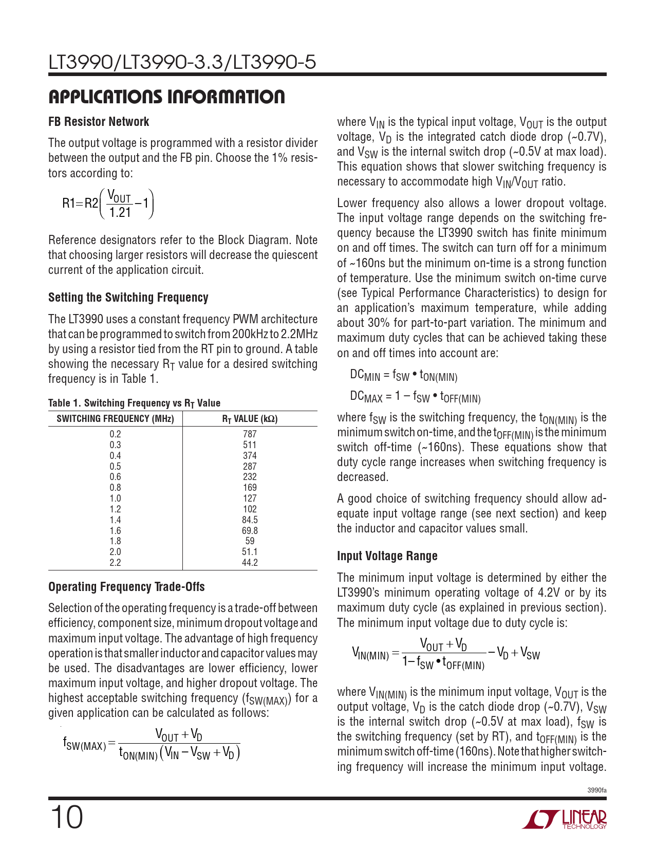 (see Typical Performance Characteristics) to design for an application’s maximum temperature, while adding The LT3990 uses a constant frequency PWM architecture about 30% for part-to-part variation. The minimum and that can be programmed to switch from 200kHz to 2.2MHz maximum duty cycles that can be achieved taking these by using a resistor tied from the RT pin to ground. A table on and off times into account are: showing the necessary RT value for a desired switching frequency is in Table 1. DCMIN = fSW • tON(MIN) DC