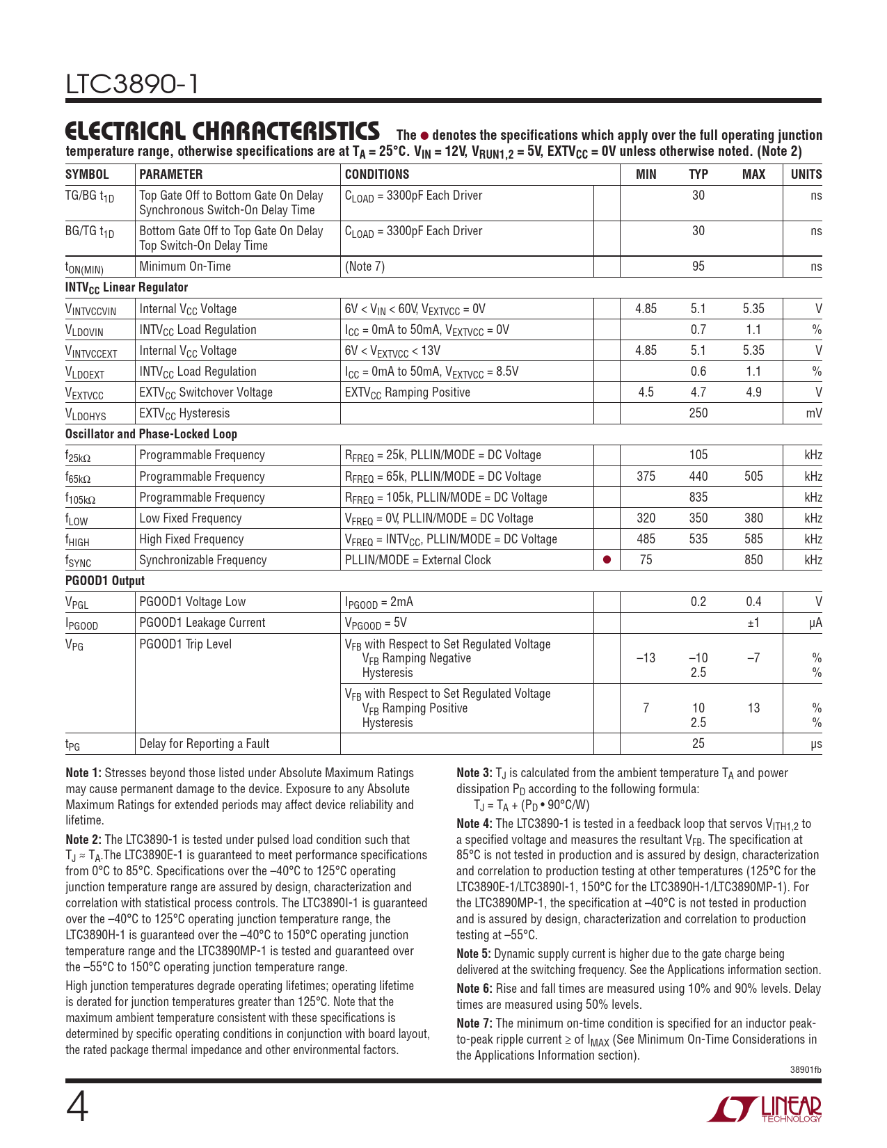 LTC3890-1 ELECTRICAL CHARACTERISTICSThe l denotes the specifications which apply over the full operating junctiontemperature range, otherwise specifications are at TA = 25°C. VIN = 12V, VRUN1,2 = 5V, EXTVCC = 0V unless otherwise noted. (Note 2)SYMBOLPARAMETERCONDITIONSMINTYPMAXUNITS TG/BG t1D Top Gate Off to Bottom Gate On Delay CLOAD = 3300pF Each Driver 30 ns Synchronous Switch-On Delay Time BG/TG t1D Bottom Gate Off to Top Gate On Delay CLOAD = 3300pF Each Driver 30 ns Top Switch-On Delay Time tON(MIN) Minimum On-Time (Note 7) 95 ns INTVCC Linear Regulator VINTVCCVIN Internal VCC Voltage 6V < VIN < 60V, VEXTVCC = 0V 4.85 5.1 5.35 V VLDOVIN INTVCC Load Regulation ICC = 0mA to 50mA, VEXTVCC = 0V 0.7 1.1 % VINTVCCEXT Internal VCC Voltage 6V < VEXTVCC < 13V 4.85 5.1 5.35 V VLDOEXT INTVCC Load Regulation ICC = 0mA to 50mA, VEXTVCC = 8.5V 0.6 1.1 % VEXTVCC EXTVCC Switchover Voltage EXTVCC Ramping Positive 4.5 4.7 4.9 V VLDOHYS EXTVCC Hysteresis 250 mV Oscillator and Phase-Locked Loop f25kΩ Programmable Frequency RFREQ = 25k, PLLIN/MODE = DC Voltage 105 kHz f65kΩ Programmable Frequency RFREQ = 65k, PLLIN/MODE = DC Voltage 375 440 505 kHz f105kΩ Programmable Frequency RFREQ = 105k, PLLIN/MODE = DC Voltage 835 kHz fLOW Low Fixed Frequency VFREQ = 0V, PLLIN/MODE = DC Voltage 320 350 380 kHz fHIGH High Fixed Frequency VFREQ = INTVCC, PLLIN/MODE = DC Voltage 485 535 585 kHz fSYNC Synchronizable Frequency PLLIN/MODE = External Clock l 75 850 kHz PGOOD1 Output VPGL PGOOD1 Voltage Low IPGOOD = 2mA 0.2 0.4 V IPGOOD PGOOD1 Leakage Current VPGOOD = 5V ±1 µA VPG PGOOD1 Trip Level VFB with Respect to Set Regulated Voltage VFB Ramping Negative –13 –10 –7 % Hysteresis 2.5 % VFB with Respect to Set Regulated Voltage VFB Ramping Positive 7 10 13 % Hysteresis 2.5 % tPG Delay for Reporting a Fault 25 µs Note 1: Stresses beyond those listed under Absolute Maximum Ratings Note 3: TJ is calculated from the ambient temperature TA and power may cause permanent damage to the device. Exposure to any Absolute dissipation PD according to the following formula: Maximum Ratings for extended periods may affect device reliability and TJ = TA + (PD • 90°C/W) lifetime. Note 4: The LTC3890-1 is tested in a feedback loop that servos VITH1,2 to Note 2: The LTC3890-1 is tested under pulsed load condition such that a specified voltage and measures the resultant VFB. The specification at TJ ≈ TA.The LTC3890E-1 is guaranteed to meet performance specifications 85°C is not tested in production and is assured by design, characterization from 0°C to 85°C. Specifications over the –40°C to 125°C operating and correlation to production testing at other temperatures (125°C for the junction temperature range are assured by design, characterization and LTC3890E-1/LTC3890I-1, 150°C for the LTC3890H-1/LTC3890MP-1). For correlation with statistical process controls. The LTC3890I-1 is guaranteed the LTC3890MP-1, the specification at –40°C is not tested in production over the –40°C to 125°C operating junction temperature range, the and is assured by design, characterization and correlation to production LTC3890H-1 is guaranteed over the –40°C to 150°C operating junction testing at –55°C. temperature range and the LTC3890MP-1 is tested and guaranteed over Note 5: Dynamic supply current is higher due to the gate charge being the –55°C to 150°C operating junction temperature range. delivered at the switching frequency. See the Applications information section. High junction temperatures degrade operating lifetimes; operating lifetime Note 6: Rise and fall times are measured using 10% and 90% levels. Delay is derated for junction temperatures greater than 125°C. Note that the times are measured using 50% levels. maximum ambient temperature consistent with these specifications is Note 7: The minimum on-time condition is specified for an inductor peak- determined by specific operating conditions in conjunction with board layout, to-peak ripple current ≥ of I the rated package thermal impedance and other environmental factors. MAX (See Minimum On-Time Considerations in the Applications Information section). 38901fb 4 Document Outline Features Description Applications Typical Application Absolute Maximum Ratings Pin Configuration Order Information Electrical Characteristics Typical Performance Characteristics Pin Functions Functional Diagram Operation Applications Information Typical Applications Package Description Revision History Typical Application Related Parts