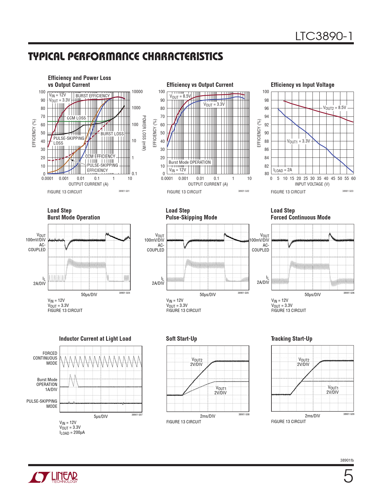 100 10000 100 100 VIN = 12V BURST EFFICIENCY VOUT = 8.5V 90 VOUT = 3.3V 90 98 VOUT = 3.3V 80 1000 80 96 VOUT2 = 8.5V POWER LOSS (mW) 70 70 94 CCM LOSS 60 100 60 92 50 BURST LOSS 50 90 PULSE-SKIPPING 40 10 40 88 VOUT1 = 3.3V EFFICIENCY (%) LOSS EFFICIENCY (%) EFFICIENCY (%) 30 30 86 20 CCM EFFICIENCY 1 20 84 Burst Mode OPERATION 10 PULSE-SKIPPING 10 82 EFFICIENCY VIN = 12V ILOAD = 2A 0 0.1 0 80 0.0001 0.001 0.01 0.1 1 10 0.0001 0.001 0.01 0.1 1 10 0 5 10 15 20 25 30 35 40 45 50 55 60 OUTPUT CURRENT (A) OUTPUT CURRENT (A) INPUT VOLTAGE (V) 38901 G01 38901 G02 FIGURE 13 CIRCUIT FIGURE 13 CIRCUIT 38901 G03 FIGURE 13 CIRCUIT