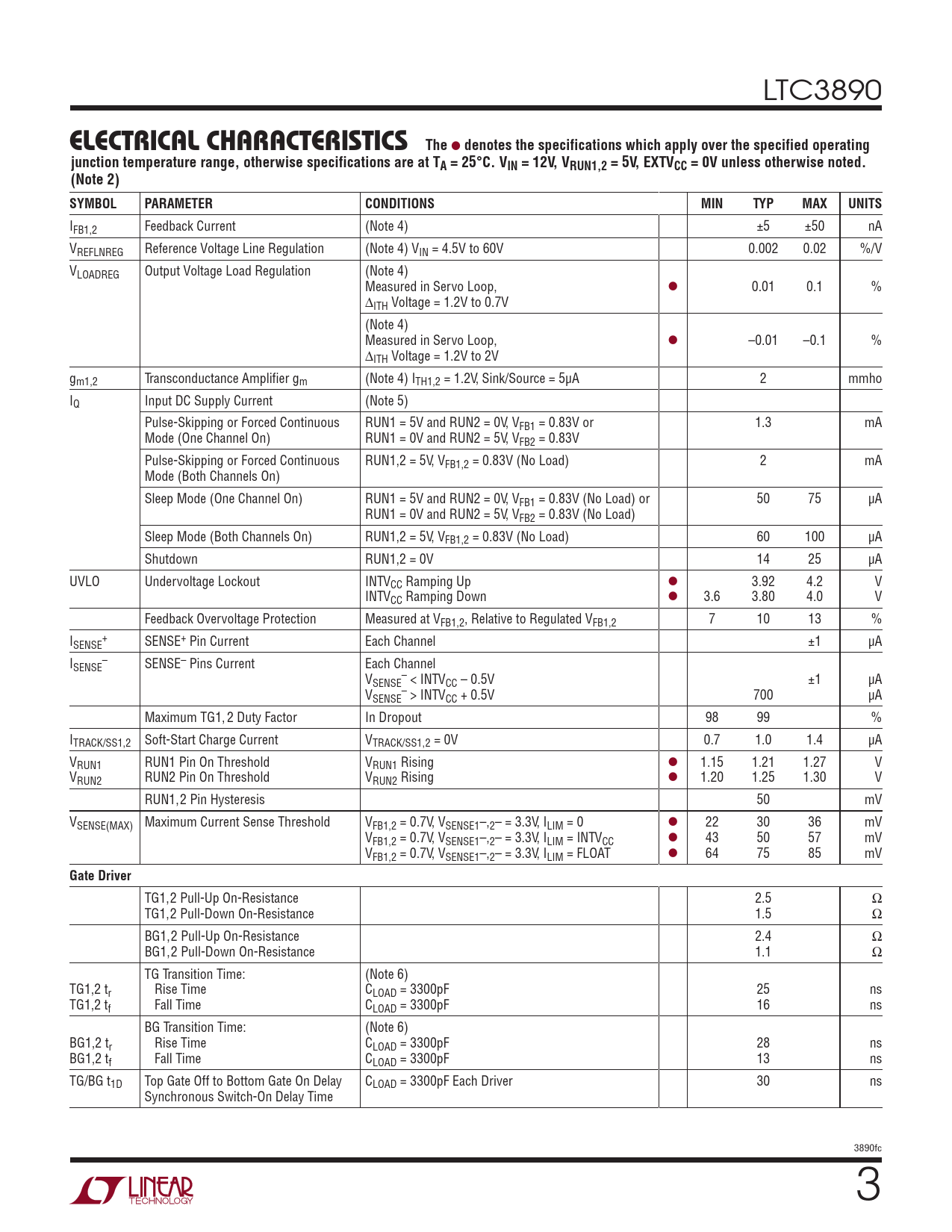 IFB1,2 Feedback Current (Note 4) ±5 ±50 nA VREFLNREG Reference Voltage Line Regulation (Note 4) VIN = 4.5V to 60V 0.002 0.02 %/V VLOADREG Output Voltage Load Regulation (Note 4) Measured in Servo Loop, l 0.01 0.1 % ∆ITH Voltage = 1.2V to 0.7V (Note 4) Measured in Servo Loop, l –0.01 –0.1 % ∆ITH Voltage = 1.2V to 2V gm1,2 Transconductance Amplifier gm (Note 4) ITH1,2 = 1.2V, Sink/Source = 5µA 2 mmho IQ Input DC Supply Current (Note 5) Pulse-Skipping or Forced Continuous RUN1 = 5V and RUN2 = 0V, VFB1 = 0.83V or 1.3 mA Mode (One Channel On) RUN1 = 0V and RUN2 = 5V, VFB2 = 0.83V Pulse-Skipping or Forced Continuous RUN1,2 = 5V, VFB1,2 = 0.83V (No Load) 2 mA Mode (Both Channels On) Sleep Mode (One Channel On) RUN1 = 5V and RUN2 = 0V, VFB1 = 0.83V (No Load) or 50 75 µA RUN1 = 0V and RUN2 = 5V, VFB2 = 0.83V (No Load) Sleep Mode (Both Channels On) RUN1,2 = 5V, VFB1,2 = 0.83V (No Load) 60 100 µA Shutdown RUN1,2 = 0V 14 25 µA UVLO Undervoltage Lockout INTVCC Ramping Up l 3.92 4.2 V INTVCC Ramping Down l 3.6 3.80 4.0 V Feedback Overvoltage Protection Measured at VFB1,2, Relative to Regulated VFB1,2 7 10 13 % I + SENSE SENSE+ Pin Current Each Channel ±1 µA I – SENSE SENSE– Pins Current Each Channel V – SENSE < INTVCC – 0.5V ±1 µA V – SENSE > INTVCC + 0.5V 700 µA Maximum TG1, 2 Duty Factor In Dropout 98 99 % ITRACK/SS1,2 Soft-Start Charge Current VTRACK/SS1,2 = 0V 0.7 1.0 1.4 µA VRUN1 RUN1 Pin On Threshold VRUN1 Rising l 1.15 1.21 1.27 V VRUN2 RUN2 Pin On Threshold VRUN2 Rising l 1.20 1.25 1.30 V RUN1,2 Pin Hysteresis 50 mV VSENSE(MAX) Maximum Current Sense Threshold VFB1,2 = 0.7V, VSENSE1–,2– = 3.3V, ILIM = 0 l 22 30 36 mV VFB1,2 = 0.7V, VSENSE1–,2– = 3.3V, ILIM = INTVCC l 43 50 57 mV VFB1,2 = 0.7V, VSENSE1–,2– = 3.3V, ILIM = FLOAT l 64 75 85 mV