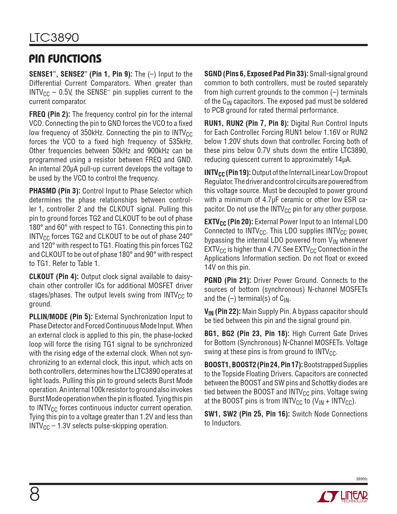 Switch Node Connections INTV to Inductors. CC – 1.3V selects pulse-skipping operation. 3890fc 8 Document Outline Features Applications Description Typical Application Absolute Maximum Ratings Pin Configuration Order Information Electrical Characteristics Typical Performance Characteristics Pin Functions Functional Diagram Operation Applications Information Typical Applications Package Description Revision History Typical Application Related Parts