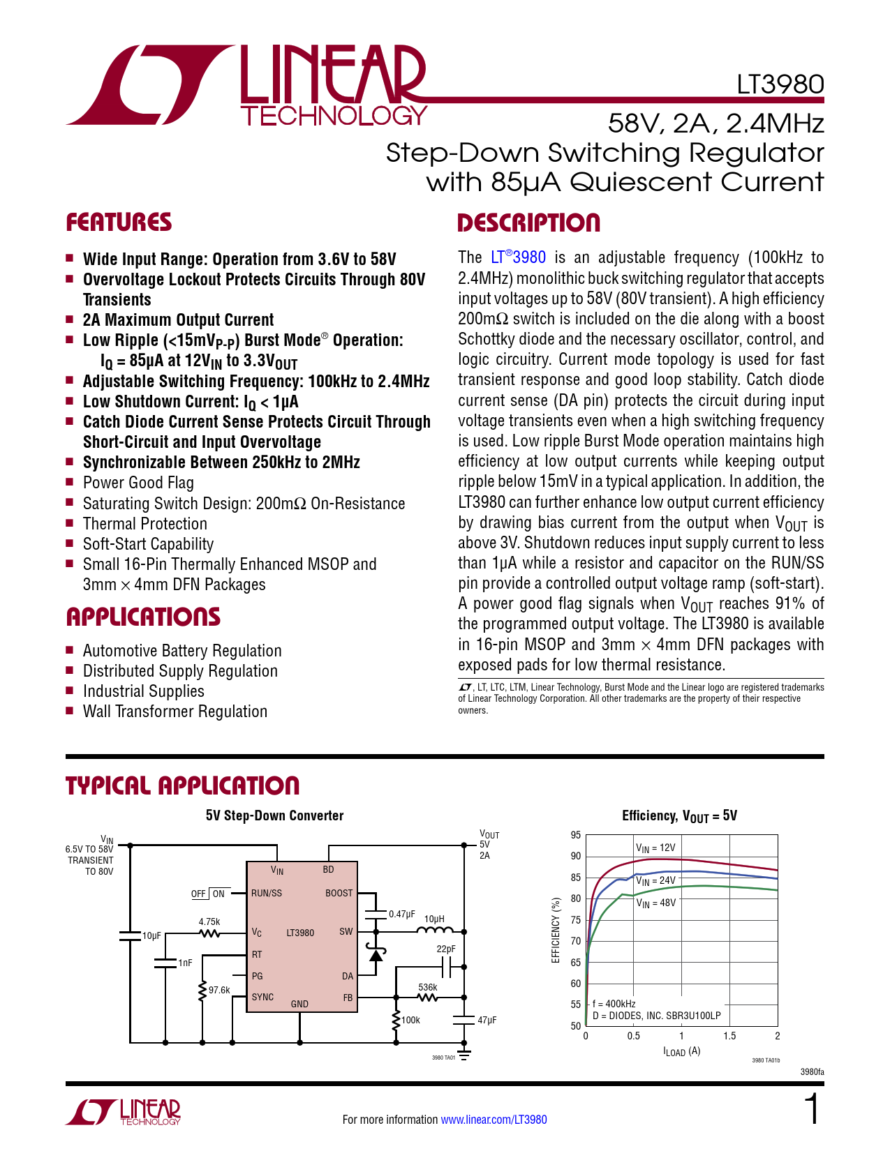 LT3980 58V, 2A, 2.4MHz Step-Down Switching Regulator with 85µA Quiescent Current FeaTuresDescripTion ■ Wide Input Range: Operation from 3.6V to 58V The LT®3980 is an adjustable frequency (100kHz to ■ Overvoltage Lockout Protects Circuits Through 80V 2.4MHz) monolithic buck switching regulator that accepts Transients input voltages up to 58V (80V transient). A high efficiency ■ 2A Maximum Output Current 200mΩ switch is included on the die along with a boost ■ Low Ripple (<15mV Schottky diode and the necessary oscillator, control, and P-P) Burst Mode ® Operation:I logic circuitry. Current mode topology is used for fast Q = 85µA at 12VIN to 3.3VOUT ■ Adjustable Switching Frequency: 100kHz to 2.4MHz transient response and good loop stability. Catch diode ■ Low Shutdown Current: I current sense (DA pin) protects the circuit during input Q < 1µA ■ Catch Diode Current Sense Protects Circuit Through voltage transients even when a high switching frequency Short-Circuit and Input Overvoltage is used. Low ripple Burst Mode operation maintains high ■ Synchronizable Between 250kHz to 2MHz efficiency at low output currents while keeping output ■ Power Good Flag ripple below 15mV in a typical application. In addition, the ■ Saturating Switch Design: 200mΩ On-Resistance LT3980 can further enhance low output current efficiency ■ Thermal Protection by drawing bias current from the output when VOUT is ■ Soft-Start Capability above 3V. Shutdown reduces input supply current to less ■ Small 16-Pin Thermally Enhanced MSOP and than 1µA while a resistor and capacitor on the RUN/SS 3mm × 4mm DFN Packages pin provide a controlled output voltage ramp (soft-start). A power good flag signals when VOUT reaches 91% of applicaTions the programmed output voltage. The LT3980 is available ■ in 16-pin MSOP and 3mm × 4mm DFN packages with Automotive Battery Regulation ■ exposed pads for low thermal resistance. Distributed Supply Regulation ■ Industrial Supplies L, LT, LTC, LTM, Linear Technology, Burst Mode and the Linear logo are registered trademarks of Linear Technology Corporation. All other trademarks are the property of their respective ■ Wall Transformer Regulation owners. Typical applicaTion5V Step-Down ConverterEfficiency, VOUT = 5V V V 95 IN OUT 6.5V TO 58V 5V VIN = 12V TRANSIENT 2A 90 TO 80V VIN BD 85 VIN = 24V OFF ON RUN/SS BOOST 80 VIN = 48V 0.47µF 4.75k 10µH 75 VC LT3980 SW 10µF 70 RT 22pF 1nF EFFICIENCY (%) 65 PG DA 60 97.6k 536k SYNC FB GND 55 f = 400kHz 100k 47µF D = DIODES, INC. SBR3U100LP 50 0 0.5 1 1.5 2 ILOAD (A) 3980 TA01 3980 TA01b 3980fa For more information www.linear.com/LT3980 1 Document Outline Features Description Applications Typical Application Absolute Maximum Ratings Pin Configuration Order Information Electrical Characteristics Typical Performance Characteristics Pin Functions Block Diagram Operation Applications Information Typical Applications Package Description Revision History Typical Application Related Parts