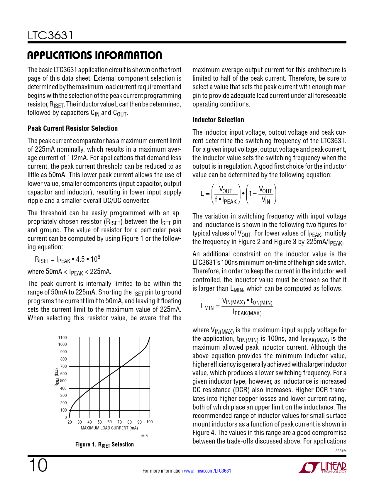 LTC3631 applicaTions inForMaTion The basic LTC3631 application circuit is shown on the front maximum average output current for this architecture is page of this data sheet. External component selection is limited to half of the peak current. Therefore, be sure to determined by the maximum load current requirement and select a value that sets the peak current with enough mar- begins with the selection of the peak current programming gin to provide adequate load current under all foreseeable resistor, RISET. The inductor value L can then be determined, operating conditions. followed by capacitors CIN and COUT. Inductor SelectionPeak Current Resistor Selection The inductor, input voltage, output voltage and peak cur- The peak current comparator has a maximum current limit rent determine the switching frequency of the LTC3631. of 225mA nominally, which results in a maximum aver- For a given input voltage, output voltage and peak current, age current of 112mA. For applications that demand less the inductor value sets the switching frequency when the current, the peak current threshold can be reduced to as output is in regulation. A good first choice for the inductor little as 50mA. This lower peak current allows the use of value can be determined by the following equation: lower value, smaller components (input capacitor, output capacitor and inductor), resulting in lower input supply V V L = OUT • 1– OUT ripple and a smaller overall DC/DC converter. f • I V PEAK IN The threshold can be easily programmed with an ap- The variation in switching frequency with input voltage propriately chosen resistor (RISET) between the ISET pin and inductance is shown in the following two figures for and ground. The value of resistor for a particular peak typical values of V current can be computed by using Figure 1 or the follow- OUT. For lower values of IPEAK, multiply the frequency in Figure 2 and Figure 3 by 225mA/I ing equation: PEAK. An additional constraint on the inductor value is the RISET = IPEAK • 4.5 • 106 LTC3631’s 100ns minimum on-time of the high side switch. where 50mA < IPEAK < 225mA. Therefore, in order to keep the current in the inductor well The peak current is internally limited to be within the controlled, the inductor value must be chosen so that it range of 50mA to 225mA. Shorting the I is larger than LMIN, which can be computed as follows: SET pin to ground programs the current limit to 50mA, and leaving it floating VIN(MAX) • tON(MIN) sets the current limit to the maximum value of 225mA. LMIN = I When selecting this resistor value, be aware that the PEAK(MAX) where VIN(MAX) is the maximum input supply voltage for 1100 the application, tON(MIN) is 100ns, and IPEAK(MAX) is the 1000 maximum allowed peak inductor current. Although the 900 above equation provides the minimum inductor value, 800 700 higher efficiency is generally achieved with a larger inductor 600 value, which produces a lower switching frequency. For a (kΩ) 500 given inductor type, however, as inductance is increased R ISET 400 DC resistance (DCR) also increases. Higher DCR trans- 300 lates into higher copper losses and lower current rating, 200 both of which place an upper limit on the inductance. The 100 0 recommended range of inductor values for small surface 20 30 40 50 60 70 80 90 100 mount inductors as a function of peak current is shown in MAXIMUM LOAD CURRENT (mA) 3631 F01 Figure 4. The values in this range are a good compromise Figure 1. R between the trade-offs discussed above. For applications ISET Selection 3631fe 10 For more information www.linear.com/LTC3631 Document Outline Features Description Applications Typical Application Absolute Maximum Ratings Pin Configuration Electrical Characteristics Typical Performance Characteristics Pin Functions Block Diagram Operation Applications Information Typical Application Related Parts