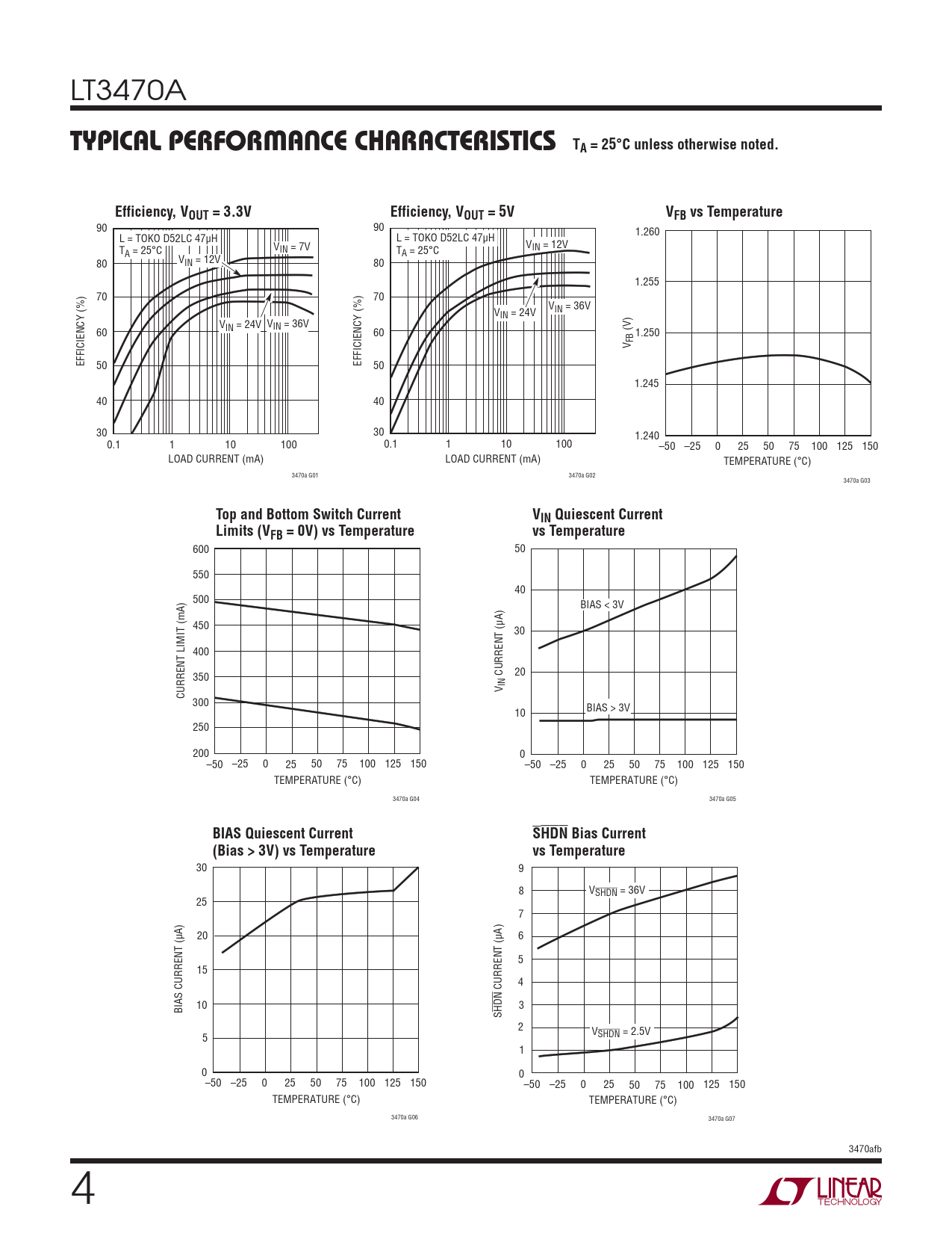 90 90 1.260 L = TOKO D52LC 47μH L = TOKO D52LC 47μH V T IN = 12V A = 25°C VIN = 7V TA = 25°C 80 VIN = 12V 80 1.255 70 70 VIN = 36V VIN = 24V V V IN = 24V IN = 36V 60 (V) 60 1.250 FBV EFFICIENCY (%) 50 EFFICIENCY (%) 50 1.245 40 40 30 30 1.240 0.1 1 10 100 0.1 1 10 100 –50 –25 0 25 50 75 100 125 150 LOAD CURRENT (mA) LOAD CURRENT (mA) TEMPERATURE (°C) 3470a G01 3470a G02 3470a G03