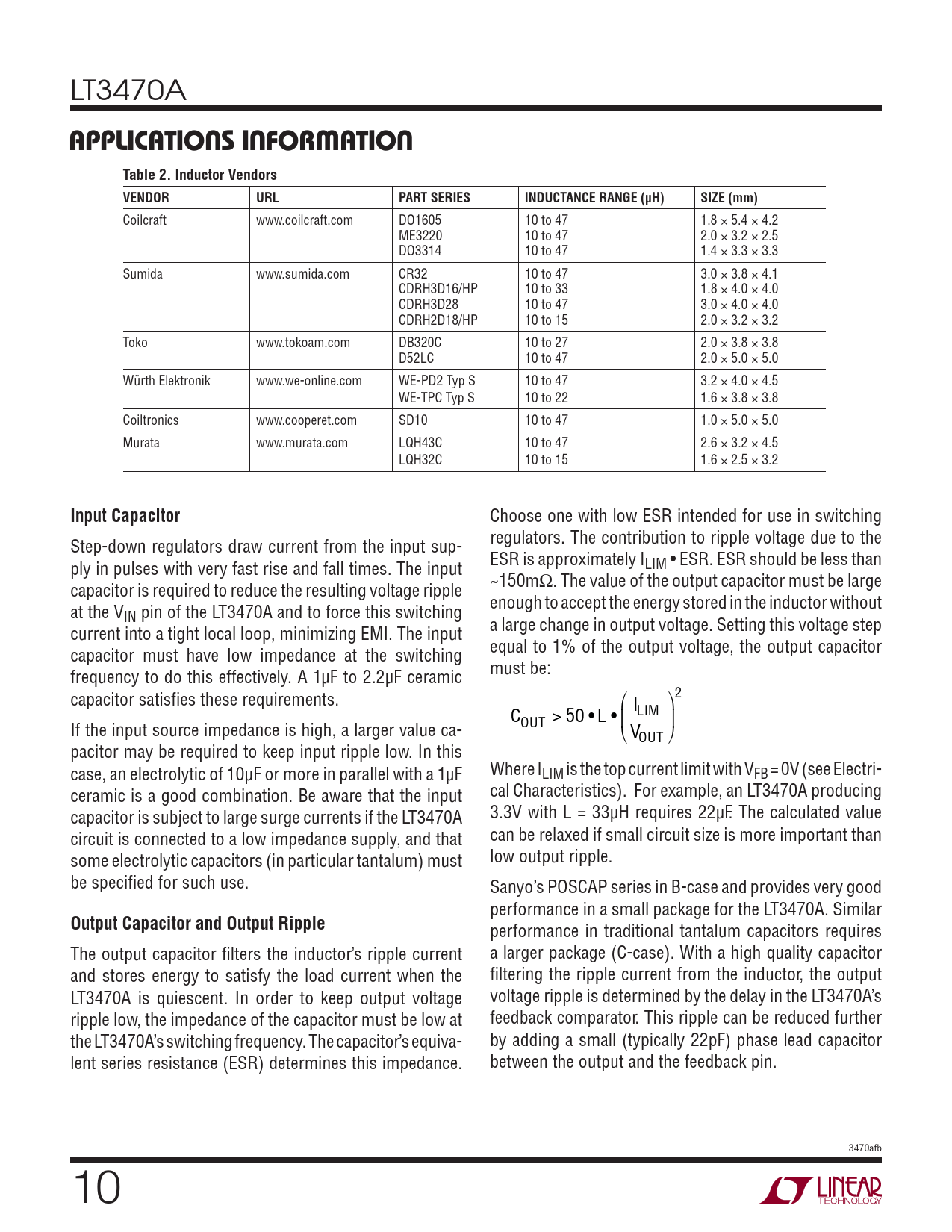 APPLICATIONS INFORMATION. Table 2. Inductor Vendors. VENDOR. URL. PART SERIES. INDUCTANCE RANGE (μH). SIZE (mm). Input Capacitor