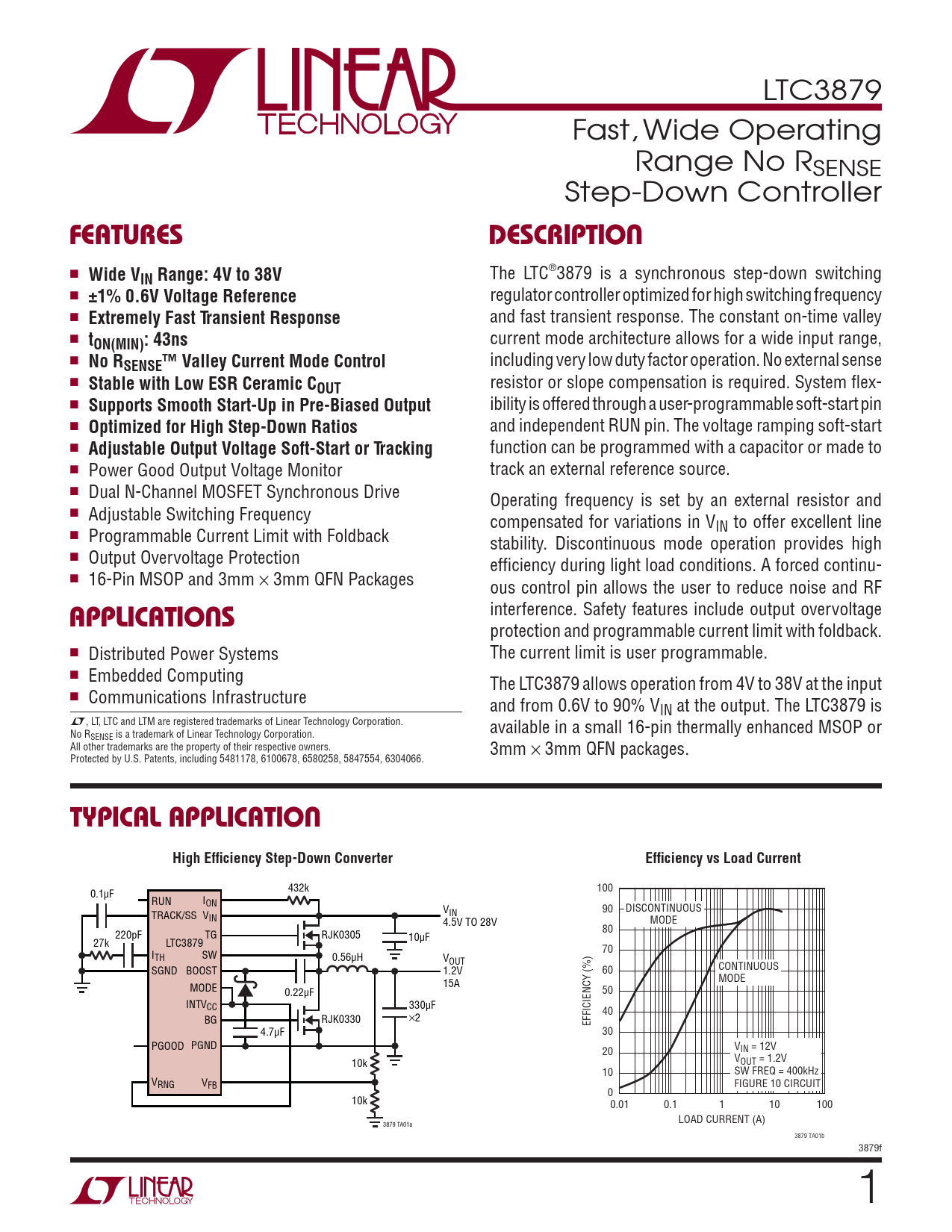 LTC3879 Fast, Wide Operating Range No RSENSE Step-Down Controller FEATURESDESCRIPTION n Wide VIN Range: 4V to 38V The LTC®3879 is a synchronous step-down switching n ±1% 0.6V Voltage Reference regulator controller optimized for high switching frequency n Extremely Fast Transient Response and fast transient response. The constant on-time valley n tON(MIN): 43ns current mode architecture allows for a wide input range, n No RSENSE™Valley Current Mode Control including very low duty factor operation. No external sense n Stable with Low ESR Ceramic COUT resistor or slope compensation is required. System fl ex- n Supports Smooth Start-Up in Pre-Biased Output ibility is offered through a user-programmable soft-start pin n Optimized for High Step-Down Ratios and independent RUN pin. The voltage ramping soft-start n Adjustable Output Voltage Soft-Start or Tracking function can be programmed with a capacitor or made to n Power Good Output Voltage Monitor track an external reference source. n Dual N-Channel MOSFET Synchronous Drive Operating frequency is set by an external resistor and n Adjustable Switching Frequency compensated for variations in V n IN to offer excellent line Programmable Current Limit with Foldback stability. Discontinuous mode operation provides high n Output Overvoltage Protection effi ciency during light load conditions. A forced continu- n 16-Pin MSOP and 3mm × 3mm QFN Packages ous control pin allows the user to reduce noise and RF APPLICATIONS interference. Safety features include output overvoltage protection and programmable current limit with foldback. n Distributed Power Systems The current limit is user programmable. n Embedded Computing The LTC3879 allows operation from 4V to 38V at the input n Communications Infrastructure and from 0.6V to 90% VIN at the output. The LTC3879 is L, LT, LTC and LTM are registered trademarks of Linear Technology Corporation. available in a small 16-pin thermally enhanced MSOP or No RSENSE is a trademark of Linear Technology Corporation. All other trademarks are the property of their respective owners. 3mm × 3mm QFN packages. Protected by U.S. Patents, including 5481178, 6100678, 6580258, 5847554, 6304066. TYPICAL APPLICATIONHigh Effi ciency Step-Down ConverterEffi ciency vs Load Current 432k 100 0.1μF RUN ION V 90 DISCONTINUOUS TRACK/SS V IN IN 4.5V TO 28V MODE 80 220pF TG RJK0305 10μF 27k LTC3879 70 ITH SW 0.56μH VOUT SGND BOOST 1.2V 60 CONTINUOUS MODE MODE 15A 0.22μF 50 INTVCC 330μF 40 BG RJK0330 s2 EFFICIENCY (%) 4.7μF 30 PGOOD PGND V 20 IN = 12V 10k VOUT = 1.2V 10 SW FREQ = 400kHz VRNG VFB FIGURE 10 CIRCUIT 0 10k 0.01 0.1 1 10 100 LOAD CURRENT (A) 3879 TA01a 3879 TA01b 3879f 1
