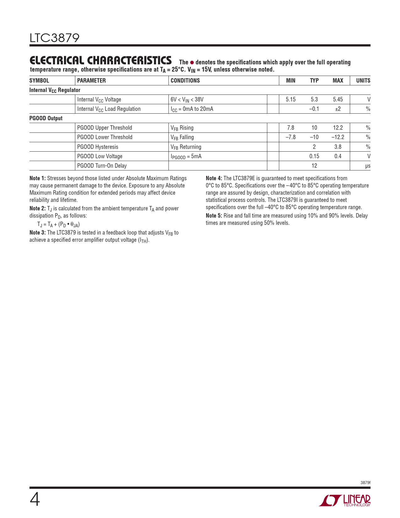The LTC3879 is tested in a feedback loop that adjusts VFB to achieve a specifi ed error amplifi er output voltage (ITH). 3879f 4
