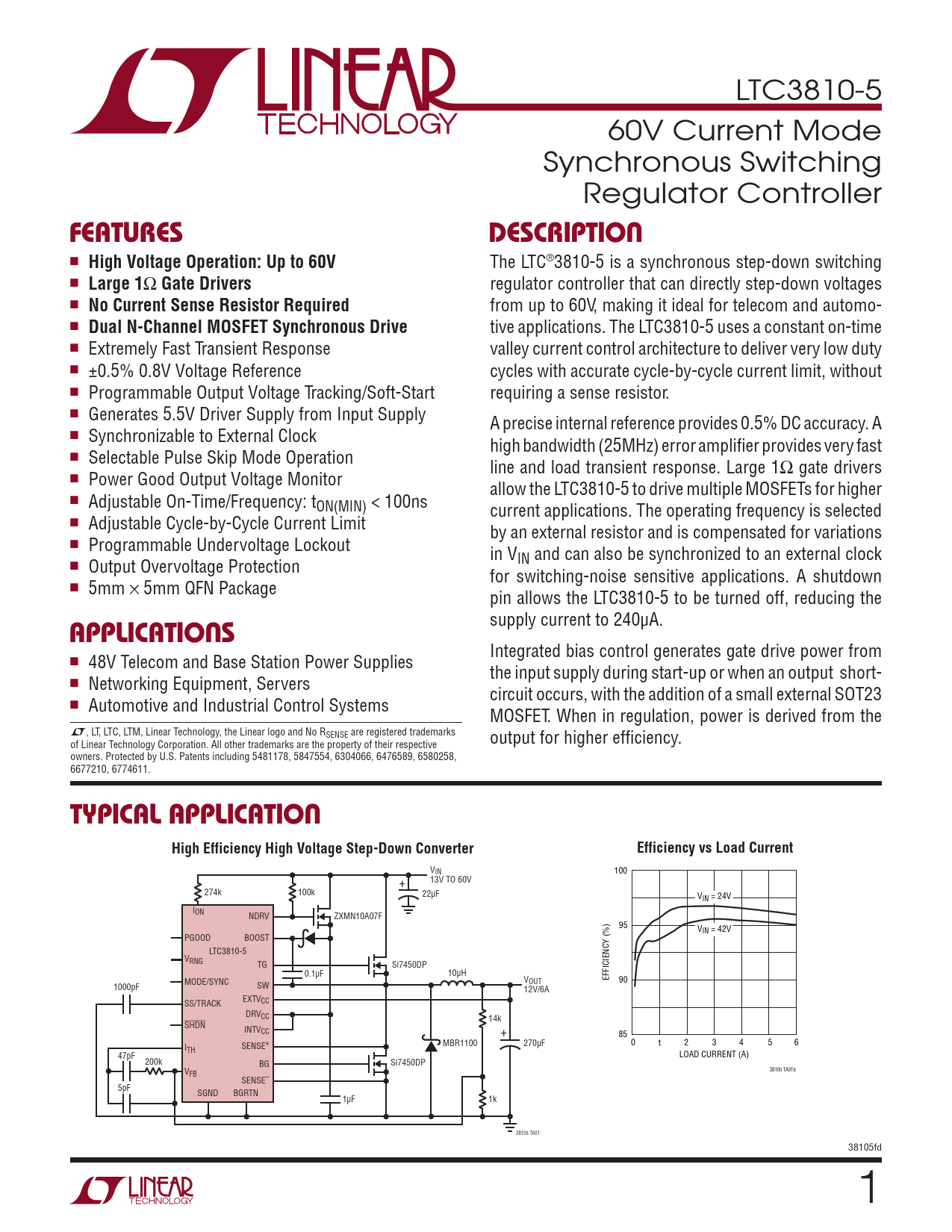 LTC3810-5 60V Current Mode Synchronous Switching Regulator Controller FeaTuresDescripTion n High Voltage Operation: Up to 60V The LTC®3810-5 is a synchronous step-down switching n Large 1 Ω Gate Drivers regulator controller that can directly step-down voltages n No Current Sense Resistor Required from up to 60V, making it ideal for telecom and automo- n Dual N-Channel MOSFET Synchronous Drive tive applications. The LTC3810-5 uses a constant on-time n Extremely Fast Transient Response valley current control architecture to deliver very low duty n ±0.5% 0.8V Voltage Reference cycles with accurate cycle-by-cycle current limit, without n Programmable Output Voltage Tracking/Soft-Start requiring a sense resistor. n Generates 5.5V Driver Supply from Input Supply A precise internal reference provides 0.5% DC accuracy. A n Synchronizable to External Clock high bandwidth (25MHz) error amplifier provides very fast n Selectable Pulse Skip Mode Operation line and load transient response. Large 1Ω gate drivers n Power Good Output Voltage Monitor allow the LTC3810-5 to drive multiple MOSFETs for higher n Adjustable On-Time/Frequency: tON(MIN) < 100ns current applications. The operating frequency is selected n Adjustable Cycle-by-Cycle Current Limit by an external resistor and is compensated for variations n Programmable Undervoltage Lockout in VIN and can also be synchronized to an external clock n Output Overvoltage Protection for switching-noise sensitive applications. A shutdown n 5mm × 5mm QFN Package pin allows the LTC3810-5 to be turned off, reducing the supply current to 240µA. applicaTions Integrated bias control generates gate drive power from n 48V Telecom and Base Station Power Supplies the input supply during start-up or when an output short- n Networking Equipment, Servers circuit occurs, with the addition of a small external SOT23 n Automotive and Industrial Control Systems MOSFET. When in regulation, power is derived from the L, LT, LTC, LTM, Linear Technology, the Linear logo and No RSENSE are registered trademarks of Linear Technology Corporation. All other trademarks are the property of their respective output for higher efficiency. owners. Protected by U.S. Patents including 5481178, 5847554, 6304066, 6476589, 6580258, 6677210, 6774611. Typical applicaTionHigh Efficiency High Voltage Step-Down ConverterEfficiency vs Load Current VIN 100 13V TO 60V + 274k 100k 22µF VIN = 24V ION NDRV ZXMN10A07F 95 VIN = 42V PGOOD BOOST LTC3810-5 VRNG TG Si7450DP 0.1µF 10µH MODE/SYNC V EFFICIENCY (%) 90 1000pF OUT SW 12V/6A SS/TRACK EXTVCC DRVCC 14k SHDN INTVCC + 85 I MBR1100 270µF 0 1 2 3 4 5 6 TH SENSE+ 47pF LOAD CURRENT (A) 200k BG Si7450DP VFB 38105 TA01b SENSE– 5pF SGND BGRTN 1µF 1k 38105 TA01 38105fd 1 Document Outline Features Applications Description Typical Application Absolute Maximum Ratings Pin Configuration Order Information Electrical Characteristics Typical Performance Characteristics Pin Functions Functional Diagram Operation Applications Information Typical Applications Package Description Revision History Typical Application Related Parts