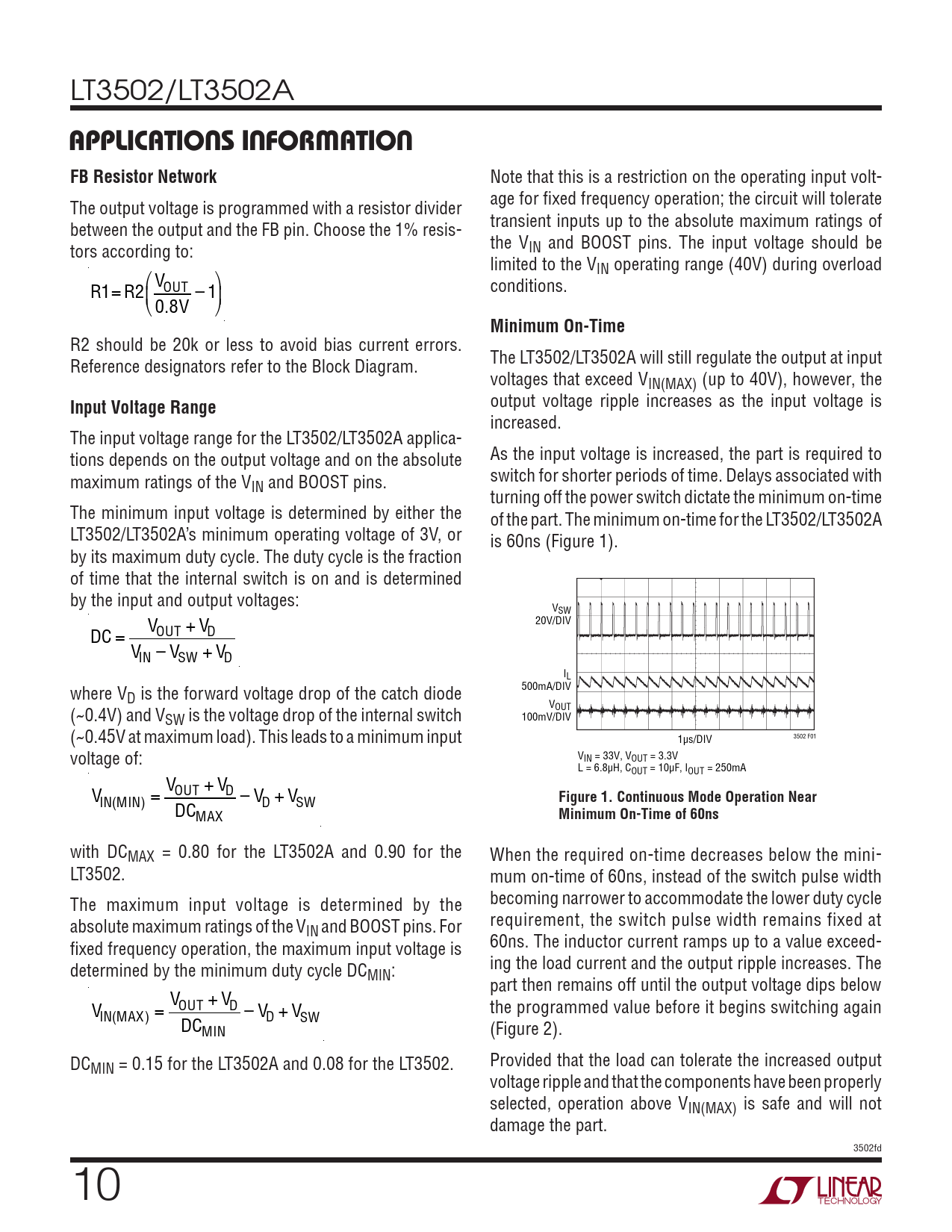 LT3502/LT3502A applications inForMationFB Resistor Network Note that this is a restriction on the operating input volt- The output voltage is programmed with a resistor divider age for fixed frequency operation; the circuit will tolerate between the output and the FB pin. Choose the 1% resis- transient inputs up to the absolute maximum ratings of tors according to: the VIN and BOOST pins. The input voltage should be limited to the VIN operating range (40V) during overload ⎛ V R1 ⎞ = R2 OUT ⎜ – 1⎟ conditions. ⎝ 0.8V ⎠ Minimum On-Time R2 should be 20k or less to avoid bias current errors. Reference designators refer to the Block Diagram. The LT3502/LT3502A will still regulate the output at input voltages that exceed VIN(MAX) (up to 40V), however, the Input Voltage Range output voltage ripple increases as the input voltage is increased. The input voltage range for the LT3502/LT3502A applica- tions depends on the output voltage and on the absolute As the input voltage is increased, the part is required to maximum ratings of the V switch for shorter periods of time. Delays associated with IN and BOOST pins. turning off the power switch dictate the minimum on-time The minimum input voltage is determined by either the of the part. The minimum on-time for the LT3502/LT3502A LT3502/LT3502A’s minimum operating voltage of 3V, or is 60ns (Figure 1). by its maximum duty cycle. The duty cycle is the fraction of time that the internal switch is on and is determined by the input and output voltages: VSW V 20V/DIV DC = OUT + VD VIN – VSW + VD IL where V 500mA/DIV D is the forward voltage drop of the catch diode (~0.4V) and V VOUT SW is the voltage drop of the internal switch 100mV/DIV (~0.45V at maximum load). This leads to a minimum input 1µs/DIV 3502 F01 voltage of: VIN = 33V, VOUT = 3.3V L = 6.8µH, COUT = 10µF, IOUT = 250mA V V OUT + VD – V Figure 1. Continuous Mode Operation Near IN(MIN) = DC D + VSW MAX Minimum On-Time of 60ns with DCMAX = 0.80 for the LT3502A and 0.90 for the When the required on-time decreases below the mini- LT3502. mum on-time of 60ns, instead of the switch pulse width The maximum input voltage is determined by the becoming narrower to accommodate the lower duty cycle absolute maximum ratings of the V requirement, the switch pulse width remains fixed at IN and BOOST pins. For fixed frequency operation, the maximum input voltage is 60ns. The inductor current ramps up to a value exceed- determined by the minimum duty cycle DC ing the load current and the output ripple increases. The MIN: part then remains off until the output voltage dips below V V OUT + VD the programmed value before it begins switching again IN(MAX) = – VD + VSW DCMIN (Figure 2). DCMIN = 0.15 for the LT3502A and 0.08 for the LT3502. Provided that the load can tolerate the increased output voltage ripple and that the components have been properly selected, operation above VIN(MAX) is safe and will not damage the part. 3502fd 10 Document Outline Features Applications Description Typical Application Absolute Maximum Ratings Pin Configuration Order Information Electrical Characteristics Typical Performance Characteristics Pin Functions Block Diagram Operation Applications Information Typical Applications Package Description Typical Application Related Parts