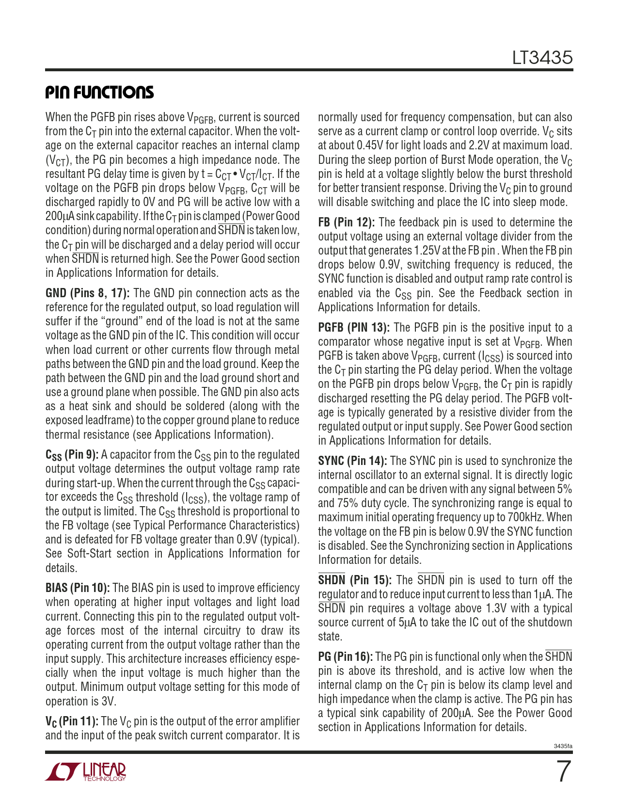 LT3435 UUUPI FU CTIO S When the PGFB pin rises above VPGFB, current is sourced normally used for frequency compensation, but can also from the CT pin into the external capacitor. When the volt- serve as a current clamp or control loop override. VC sits age on the external capacitor reaches an internal clamp at about 0.45V for light loads and 2.2V at maximum load. (VCT), the PG pin becomes a high impedance node. The During the sleep portion of Burst Mode operation, the VC resultant PG delay time is given by t = CCT • VCT/ICT. If the pin is held at a voltage slightly below the burst threshold voltage on the PGFB pin drops below VPGFB, CCT will be for better transient response. Driving the VC pin to ground discharged rapidly to 0V and PG will be active low with a will disable switching and place the IC into sleep mode. 200µA sink capability. If the CT pin is clamped (Power Good FB (Pin 12): The feedback pin is used to determine the condition) during normal operation and SHDN is taken low, output voltage using an external voltage divider from the the CT pin will be discharged and a delay period will occur output that generates 1.25V at the FB pin . When the FB pin when SHDN is returned high. See the Power Good section drops below 0.9V, switching frequency is reduced, the in Applications Information for details. SYNC function is disabled and output ramp rate control is GND (Pins 8, 17): The GND pin connection acts as the enabled via the CSS pin. See the Feedback section in reference for the regulated output, so load regulation will Applications Information for details. suffer if the “ground” end of the load is not at the same PGFB (PIN 13): The PGFB pin is the positive input to a voltage as the GND pin of the IC. This condition will occur comparator whose negative input is set at V when load current or other currents flow through metal PGFB. When PGFB is taken above V paths between the GND pin and the load ground. Keep the PGFB, current (ICSS) is sourced into the C path between the GND pin and the load ground short and T pin starting the PG delay period. When the voltage on the PGFB pin drops below V use a ground plane when possible. The GND pin also acts PGFB, the CT pin is rapidly discharged resetting the PG delay period. The PGFB volt- as a heat sink and should be soldered (along with the age is typically generated by a resistive divider from the exposed leadframe) to the copper ground plane to reduce regulated output or input supply. See Power Good section thermal resistance (see Applications Information). in Applications Information for details. CSS (Pin 9): A capacitor from the CSS pin to the regulated SYNC (Pin 14): The SYNC pin is used to synchronize the output voltage determines the output voltage ramp rate internal oscillator to an external signal. It is directly logic during start-up. When the current through the CSS capaci- compatible and can be driven with any signal between 5% tor exceeds the CSS threshold (ICSS), the voltage ramp of and 75% duty cycle. The synchronizing range is equal to the output is limited. The CSS threshold is proportional to maximum initial operating frequency up to 700kHz. When the FB voltage (see Typical Performance Characteristics) the voltage on the FB pin is below 0.9V the SYNC function and is defeated for FB voltage greater than 0.9V (typical). is disabled. See the Synchronizing section in Applications See Soft-Start section in Applications Information for Information for details. details. SHDN (Pin 15): The SHDN pin is used to turn off the BIAS (Pin 10): The BIAS pin is used to improve efficiency regulator and to reduce input current to less than 1µA. The when operating at higher input voltages and light load SHDN pin requires a voltage above 1.3V with a typical current. Connecting this pin to the regulated output volt- source current of 5µA to take the IC out of the shutdown age forces most of the internal circuitry to draw its state. operating current from the output voltage rather than the input supply. This architecture increases efficiency espe- PG (Pin 16): The PG pin is functional only when the SHDN cially when the input voltage is much higher than the pin is above its threshold, and is active low when the output. Minimum output voltage setting for this mode of internal clamp on the CT pin is below its clamp level and operation is 3V. high impedance when the clamp is active. The PG pin has a typical sink capability of 200µA. See the Power Good VC (Pin 11): The VC pin is the output of the error amplifier section in Applications Information for details. and the input of the peak switch current comparator. It is 3435fa 7