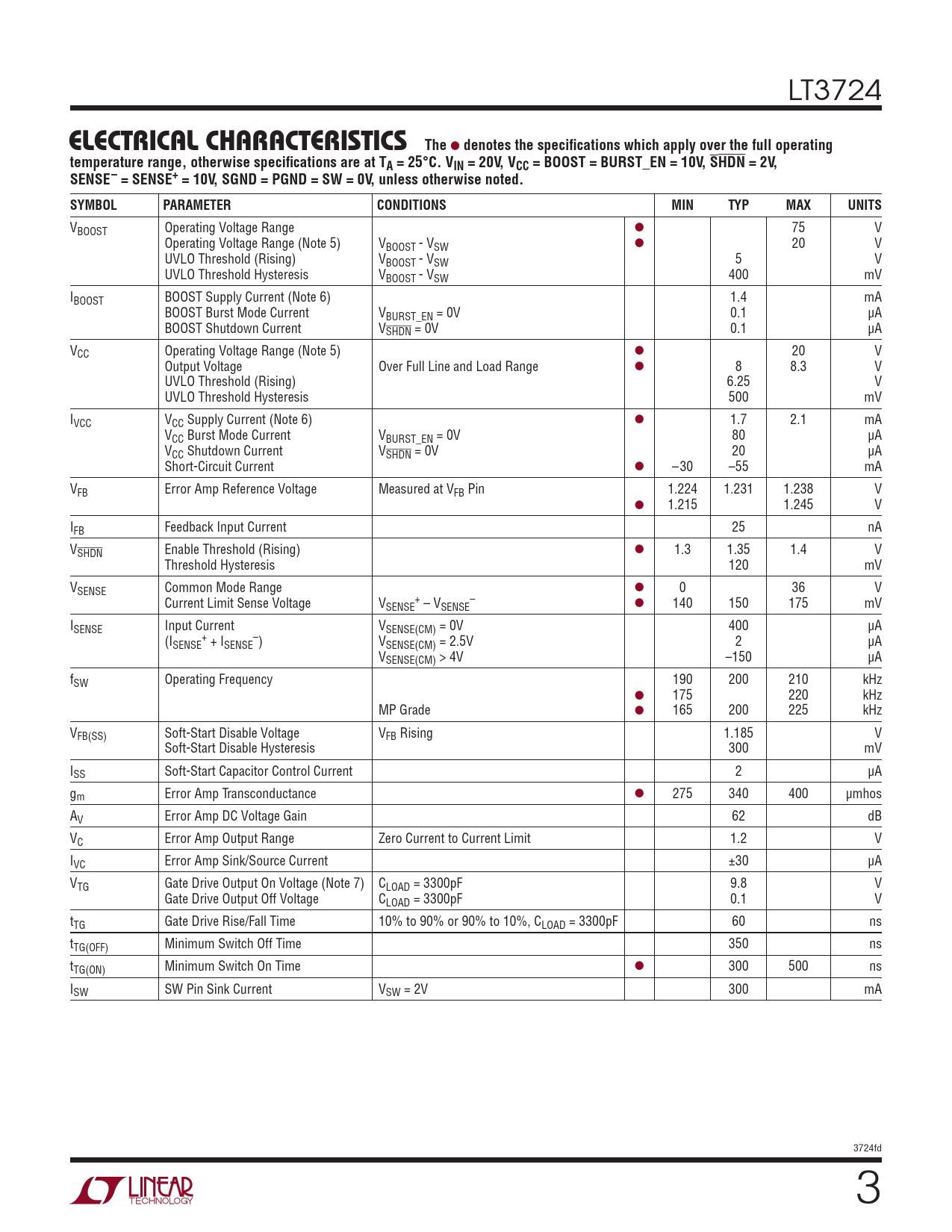 VBOOST Operating Voltage Range l 75 V Operating Voltage Range (Note 5) VBOOST - VSW l 20 V UVLO Threshold (Rising) VBOOST - VSW 5 V UVLO Threshold Hysteresis VBOOST - VSW 400 mV IBOOST BOOST Supply Current (Note 6) 1.4 mA BOOST Burst Mode Current VBURST_EN = 0V 0.1 µA BOOST Shutdown Current VSHDN = 0V 0.1 µA VCC Operating Voltage Range (Note 5) l 20 V Output Voltage Over Full Line and Load Range l 8 8.3 V UVLO Threshold (Rising) 6.25 V UVLO Threshold Hysteresis 500 mV IVCC VCC Supply Current (Note 6) l 1.7 2.1 mA VCC Burst Mode Current VBURST_EN = 0V 80 µA VCC Shutdown Current VSHDN = 0V 20 µA Short-Circuit Current l –30 –55 mA VFB Error Amp Reference Voltage Measured at VFB Pin 1.224 1.231 1.238 V l 1.215 1.245 V IFB Feedback Input Current 25 nA VSHDN Enable Threshold (Rising) l 1.3 1.35 1.4 V Threshold Hysteresis 120 mV VSENSE Common Mode Range l 0 36 V Current Limit Sense Voltage V + – SENSE – VSENSE l 140 150 175 mV ISENSE Input Current VSENSE(CM) = 0V 400 µA (I + – SENSE + ISENSE ) VSENSE(CM) = 2.5V 2 µA VSENSE(CM) > 4V –150 µA fSW Operating Frequency 190 200 210 kHz l 175 220 kHz MP Grade l 165 200 225 kHz VFB(SS) Soft-Start Disable Voltage VFB Rising 1.185 V Soft-Start Disable Hysteresis 300 mV ISS Soft-Start Capacitor Control Current 2 µA gm Error Amp Transconductance l 275 340 400 µmhos AV Error Amp DC Voltage Gain 62 dB VC Error Amp Output Range Zero Current to Current Limit 1.2 V IVC Error Amp Sink/Source Current ±30 µA VTG Gate Drive Output On Voltage (Note 7) CLOAD = 3300pF 9.8 V Gate Drive Output Off Voltage CLOAD = 3300pF 0.1 V tTG Gate Drive Rise/Fall Time 10% to 90% or 90% to 10%, CLOAD = 3300pF 60 ns tTG(OFF) Minimum Switch Off Time 350 ns tTG(ON) Minimum Switch On Time l 300 500 ns ISW SW Pin Sink Current VSW = 2V 300 mA 3724fd 3
