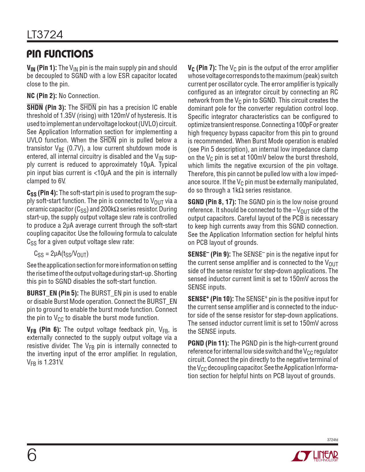 PIN FUNCTIONS. VIN (Pin 1):. VC (Pin 7):. NC (Pin 2):. SHDN (Pin 3):. SS (Pin 4):. SGND (Pin 8, 17):. SENSE– (Pin 9):