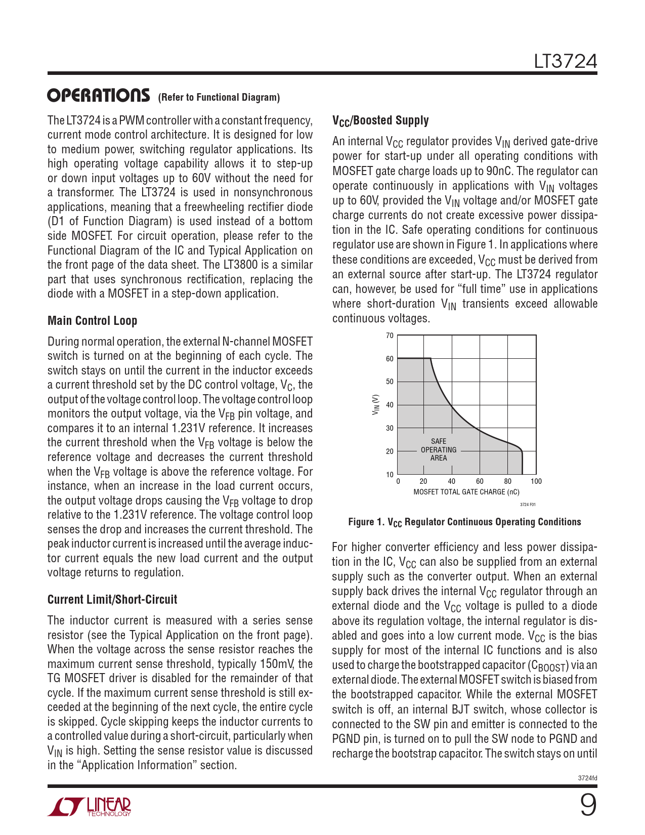 current mode control architecture. It is designed for low to medium power, switching regulator applications. Its An internal VCC regulator provides VIN derived gate-drive high operating voltage capability allows it to step-up power for start-up under all operating conditions with or down input voltages up to 60V without the need for MOSFET gate charge loads up to 90nC. The regulator can a transformer. The LT3724 is used in nonsynchronous operate continuously in applications with VIN voltages applications, meaning that a freewheeling rectifier diode up to 60V, provided the VIN voltage and/or MOSFET gate (D1 of Function Diagram) is used instead of a bottom charge currents do not create excessive power dissipa- side MOSFET. For circuit operation, please refer to the tion in the IC. Safe operating conditions for continuous Functional Diagram of the IC and Typical Application on regulator use are shown in Figure 1. In applications where the front page of the data sheet. The LT3800 is a similar these conditions are exceeded, VCC must be derived from part that uses synchronous rectification, replacing the an external source after start-up. The LT3724 regulator diode with a MOSFET in a step-down application. can, however, be used for “full time” use in applications where short-duration VIN transients exceed allowable