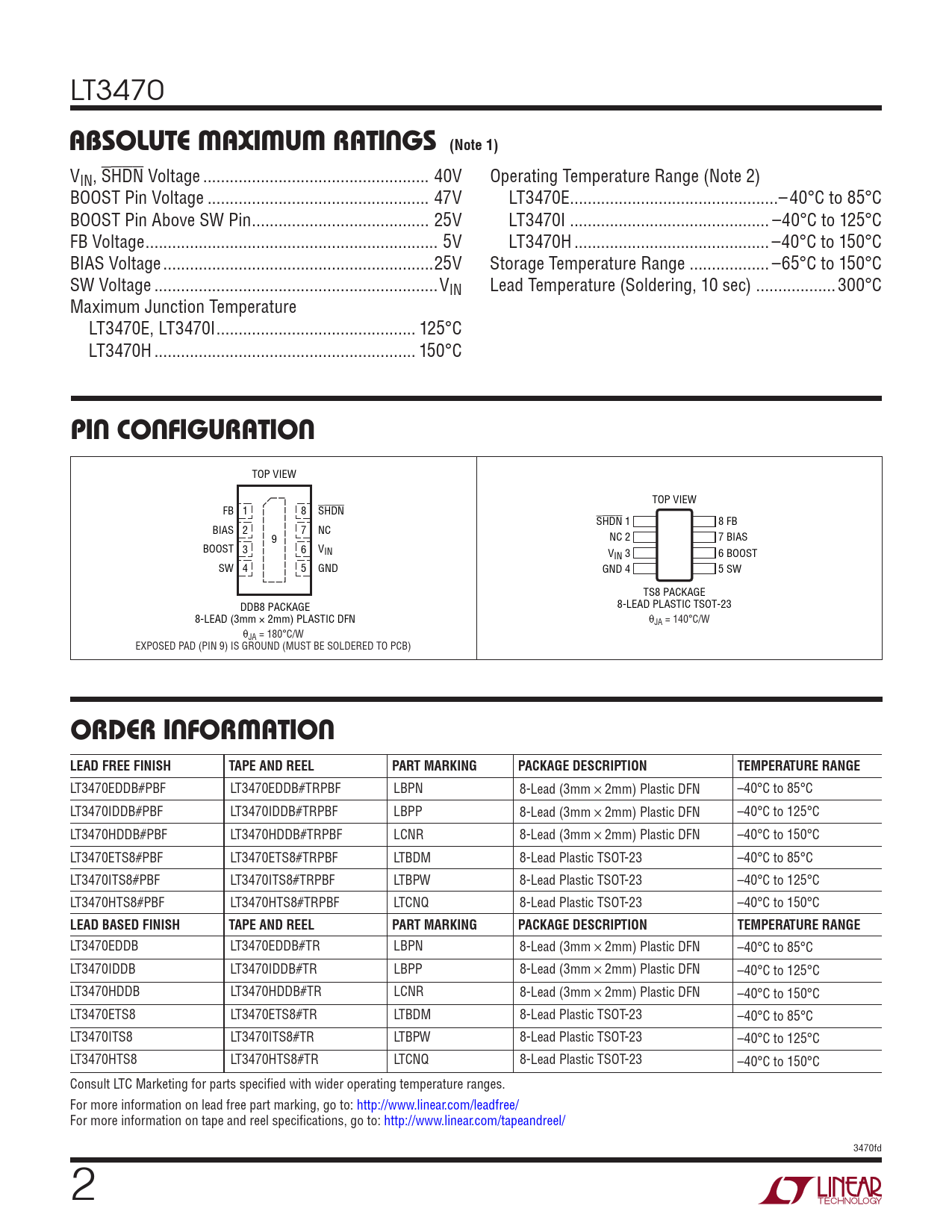 LT3470EDDB#PBF LT3470EDDB#TRPBF LBPN 8-Lead (3mm × 2mm) Plastic DFN –40°C to 85°C LT3470IDDB#PBF LT3470IDDB#TRPBF LBPP 8-Lead (3mm × 2mm) Plastic DFN –40°C to 125°C LT3470HDDB#PBF LT3470HDDB#TRPBF LCNR 8-Lead (3mm × 2mm) Plastic DFN –40°C to 150°C LT3470ETS8#PBF LT3470ETS8#TRPBF LTBDM 8-Lead Plastic TSOT-23 –40°C to 85°C LT3470ITS8#PBF LT3470ITS8#TRPBF LTBPW 8-Lead Plastic TSOT-23 –40°C to 125°C LT3470HTS8#PBF LT3470HTS8#TRPBF LTCNQ 8-Lead Plastic TSOT-23 –40°C to 150°C
