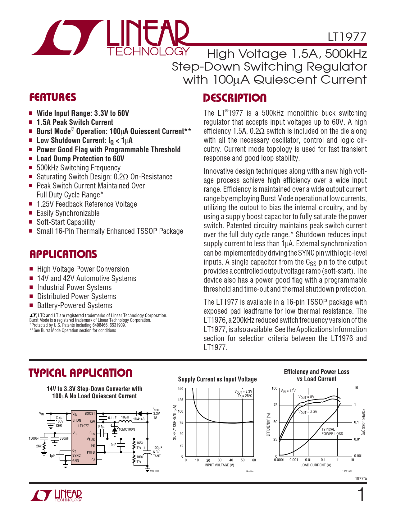 LT1977 High Voltage 1.5A, 500kHz Step-Down Switching Regulator with 100µA Quiescent Current UFEATURESDESCRIPTIO ■ Wide Input Range: 3.3V to 60V The LT®1977 is a 500kHz monolithic buck switching ■ 1.5A Peak Switch Current regulator that accepts input voltages up to 60V. A high ■ Burst Mode® Operation: 100 µ A Quiescent Current** efficiency 1.5A, 0.2Ω switch is included on the die along ■ Low Shutdown Current: IQ < 1 µ A with all the necessary oscillator, control and logic cir- ■ Power Good Flag with Programmable Threshold cuitry. Current mode topology is used for fast transient ■ Load Dump Protection to 60V response and good loop stability. ■ 500kHz Switching Frequency Innovative design techniques along with a new high volt- ■ Saturating Switch Design: 0.2Ω On-Resistance age process achieve high efficiency over a wide input ■ Peak Switch Current Maintained Over range. Efficiency is maintained over a wide output current Full Duty Cycle Range* range by employing Burst Mode operation at low currents, ■ 1.25V Feedback Reference Voltage utilizing the output to bias the internal circuitry, and by ■ Easily Synchronizable using a supply boost capacitor to fully saturate the power ■ Soft-Start Capability switch. Patented circuitry maintains peak switch current ■ Small 16-Pin Thermally Enhanced TSSOP Package over the full duty cycle range.* Shutdown reduces input supply current to less than 1µA. External synchronization U can be implemented by driving the SYNC pin with logic-level APPLICATIO S inputs. A single capacitor from the CSS pin to the output ■ High Voltage Power Conversion provides a controlled output voltage ramp (soft-start). The ■ 14V and 42V Automotive Systems device also has a power good flag with a programmable ■ Industrial Power Systems threshold and time-out and thermal shutdown protection. ■ Distributed Power Systems ■ Battery-Powered Systems The LT1977 is available in a 16-pin TSSOP package with exposed pad leadframe for low thermal resistance. The , LTC and LT are registered trademarks of Linear Technology Corporation. Burst Mode is a registered trademark of Linear Technology Corporation. LT1976, a 200kHz reduced switch frequency version of the *Protected by U.S. Patents including 6498466, 6531909. **See Burst Mode Operation section for conditions LT1977, is also available. See the Applications Information section for selection criteria between the LT1976 and LT1977. UEfficiency and Power LossTYPICAL APPLICATIOSupply Current vs Input Voltagevs Load Current14V to 3.3V Step-Down Converter with 150 100 10 V V OUT = 3.3V IN = 12V 100 µ A No Load Quiescent Current TA = 25°C VOUT = 5V 125 75 1 POWER LOSS (W) VOUT µA) 100 V V IN V OUT = 3.3V IN BOOST 3.3V 2.2µF 0.1µF 10µH 1A SHDN 1N4148 100V SW 75 50 0.1 CER LT1977 0.1µF 10MQ100N TYPICAL V C C SS 50 EFFICIENCY (%) POWER LOSS 1500pF 330pF VBIAS SUPPLY CURRENT ( 25 0.01 165k 26k FB 10pF 25 1% + 100µF CT PGFB 6.3V 1µF SYNC TANT 100k 0 0 0.001 GND PG 1% 0 10 20 30 40 50 60 0.0001 0.001 0.01 0.1 1 10 INPUT VOLTAGE (V) LOAD CURRENT (A) 1977 TA01 1977 F05 1977 TA02 1977fa 1