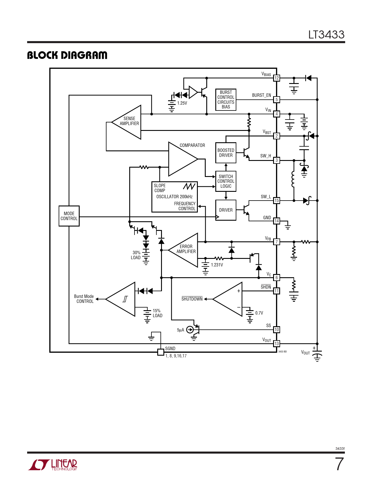 VBIAS 12 BURST BURST_EN CONTROL 5 CIRCUITS 1.25V BIAS VIN 4 SENSE AMPLIFIER VBST 2 COMPARATOR BOOSTED DRIVER SW_H 3 SWITCH CONTROL SLOPE LOGIC COMP OSCILLATOR 200kHz SW_L 15 FREQUENCY CONTROL DRIVER MODE GND CONTROL 14 VFB 7 ERROR AMPLIFIER 30% LOAD 1.231V VC 6 SHDN + 11 Burst Mode SHUTDOWN CONTROL – 15% 0.7V LOAD SS 5µA 10 VOUT 13 SGND + 3433 BD VOUT 1, 8, 9,16,17 3433f 7