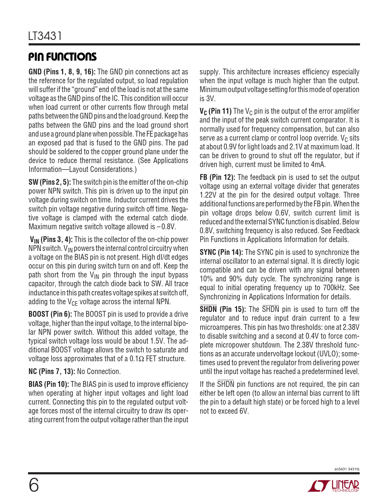 LT3431 UUUPI FU CTIO SGND (Pins 1, 8, 9, 16): The GND pin connections act as supply. This architecture increases efficiency especially the reference for the regulated output, so load regulation when the input voltage is much higher than the output. will suffer if the “ground” end of the load is not at the same Minimum output voltage setting for this mode of operation voltage as the GND pins of the IC. This condition will occur is 3V. when load current or other currents flow through metal V paths between the GND pins and the load ground. Keep the C (Pin 11) The VC pin is the output of the error amplifier and the input of the peak switch current comparator. It is paths between the GND pins and the load ground short normally used for frequency compensation, but can also and use a ground plane when possible. The FE package has serve as a current clamp or control loop override. V an exposed pad that is fused to the GND pins. The pad C sits at about 0.9V for light loads and 2.1V at maximum load. It should be soldered to the copper ground plane under the can be driven to ground to shut off the regulator, but if device to reduce thermal resistance. (See Applications driven high, current must be limited to 4mA. Information—Layout Considerations.) FB (Pin 12): The feedback pin is used to set the output SW (Pins 2, 5): The switch pin is the emitter of the on-chip voltage using an external voltage divider that generates power NPN switch. This pin is driven up to the input pin 1.22V at the pin for the desired output voltage. Three voltage during switch on time. Inductor current drives the additional functions are performed by the FB pin. When the switch pin voltage negative during switch off time. Nega- pin voltage drops below 0.6V, switch current limit is tive voltage is clamped with the external catch diode. reduced and the external SYNC function is disabled. Below Maximum negative switch voltage allowed is – 0.8V. 0.8V, switching frequency is also reduced. See Feedback VIN (Pins 3, 4): This is the collector of the on-chip power Pin Functions in Applications Information for details. NPN switch. VIN powers the internal control circuitry when SYNC (Pin 14): The SYNC pin is used to synchronize the a voltage on the BIAS pin is not present. High dI/dt edges internal oscillator to an external signal. It is directly logic occur on this pin during switch turn on and off. Keep the compatible and can be driven with any signal between path short from the VIN pin through the input bypass 10% and 90% duty cycle. The synchronizing range is capacitor, through the catch diode back to SW. All trace equal to initial operating frequency up to 700kHz. See inductance in this path creates voltage spikes at switch off, Synchronizing in Applications Information for details. adding to the VCE voltage across the internal NPN. SHDN (Pin 15): The SHDN pin is used to turn off the BOOST (Pin 6): The BOOST pin is used to provide a drive regulator and to reduce input drain current to a few voltage, higher than the input voltage, to the internal bipo- microamperes. This pin has two thresholds: one at 2.38V lar NPN power switch. Without this added voltage, the to disable switching and a second at 0.4V to force com- typical switch voltage loss would be about 1.5V. The ad- plete micropower shutdown. The 2.38V threshold func- ditional BOOST voltage allows the switch to saturate and tions as an accurate undervoltage lockout (UVLO); some- voltage loss approximates that of a 0.1Ω FET structure. times used to prevent the regulator from delivering power NC (Pins 7, 13): No Connection. until the input voltage has reached a predetermined level. BIAS (Pin 10): The BIAS pin is used to improve efficiency If the SHDN pin functions are not required, the pin can when operating at higher input voltages and light load either be left open (to allow an internal bias current to lift current. Connecting this pin to the regulated output volt- the pin to a default high state) or be forced high to a level age forces most of the internal circuitry to draw its oper- not to exceed 6V. ating current from the output voltage rather than the input sn3431 3431fs 6
