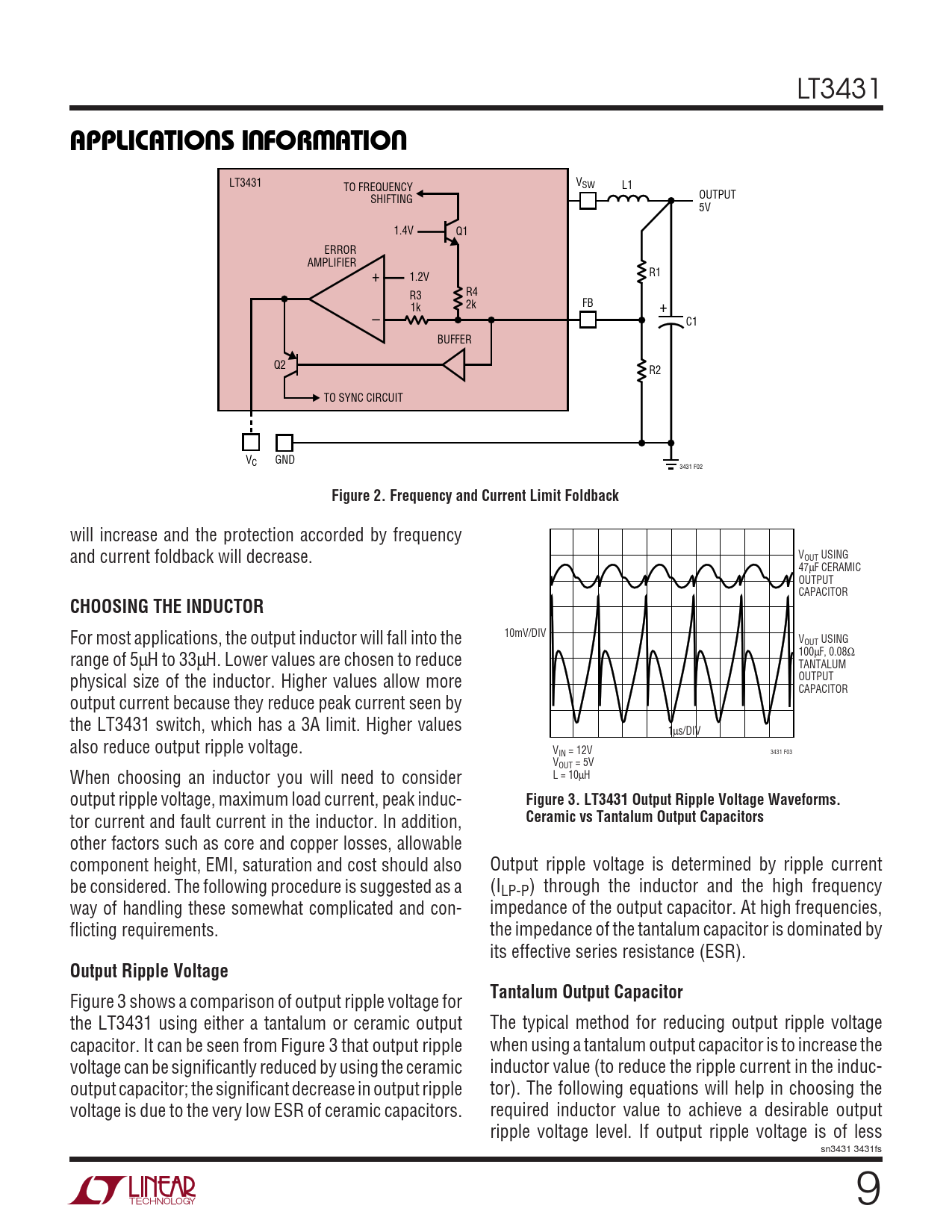 LT3431 UUWUAPPLICATIO S I FOR ATIO LT3431 VSW TO FREQUENCY L1 SHIFTING OUTPUT 5V 1.4V Q1 ERROR AMPLIFIER + 1.2V R1 R3 R4 1k 2k FB + – C1 BUFFER Q2 R2 TO SYNC CIRCUIT VC GND 3431 F02 Figure 2. Frequency and Current Limit Foldback will increase and the protection accorded by frequency and current foldback will decrease. VOUT USING 47µF CERAMIC OUTPUT CAPACITOR CHOOSING THE INDUCTOR 10mV/DIV For most applications, the output inductor will fall into the VOUT USING range of 5µH to 33µH. Lower values are chosen to reduce 100µF, 0.08Ω TANTALUM physical size of the inductor. Higher values allow more OUTPUT CAPACITOR output current because they reduce peak current seen by the LT3431 switch, which has a 3A limit. Higher values 1µs/DIV also reduce output ripple voltage. VIN = 12V 3431 F03 VOUT = 5V When choosing an inductor you will need to consider L = 10µH output ripple voltage, maximum load current, peak induc- Figure 3. LT3431 Output Ripple Voltage Waveforms. tor current and fault current in the inductor. In addition, Ceramic vs Tantalum Output Capacitors other factors such as core and copper losses, allowable component height, EMI, saturation and cost should also Output ripple voltage is determined by ripple current be considered. The following procedure is suggested as a (ILP-P) through the inductor and the high frequency way of handling these somewhat complicated and con- impedance of the output capacitor. At high frequencies, flicting requirements. the impedance of the tantalum capacitor is dominated by its effective series resistance (ESR). Output Ripple VoltageTantalum Output Capacitor Figure 3 shows a comparison of output ripple voltage for the LT3431 using either a tantalum or ceramic output The typical method for reducing output ripple voltage capacitor. It can be seen from Figure 3 that output ripple when using a tantalum output capacitor is to increase the voltage can be significantly reduced by using the ceramic inductor value (to reduce the ripple current in the induc- output capacitor; the significant decrease in output ripple tor). The following equations will help in choosing the voltage is due to the very low ESR of ceramic capacitors. required inductor value to achieve a desirable output ripple voltage level. If output ripple voltage is of less sn3431 3431fs 9