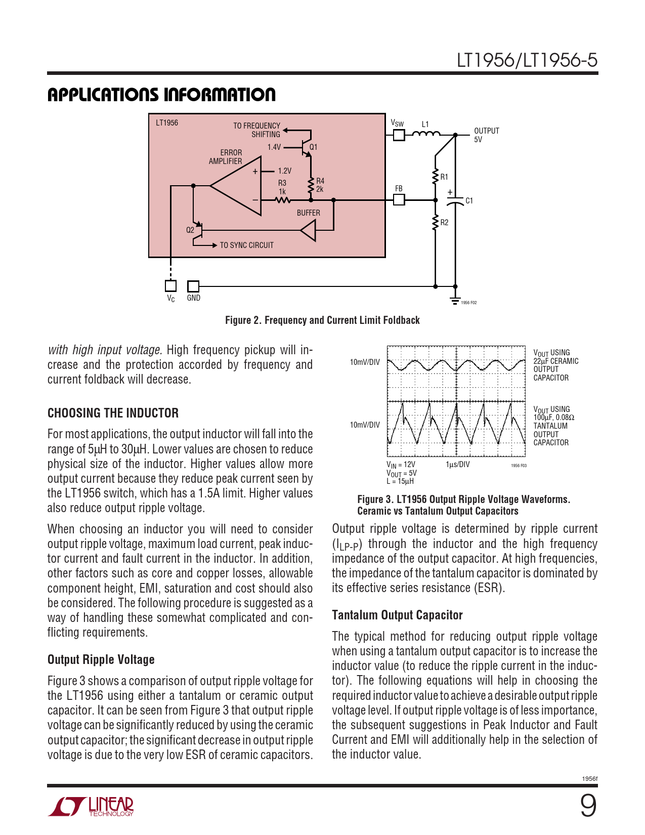 inductor value (to reduce the ripple current in the induc- Figure 3 shows a comparison of output ripple voltage for tor). The following equations will help in choosing the the LT1956 using either a tantalum or ceramic output required inductor value to achieve a desirable output ripple capacitor. It can be seen from Figure 3 that output ripple voltage level. If output ripple voltage is of less importance, voltage can be significantly reduced by using the ceramic the subsequent suggestions in Peak Inductor and Fault output capacitor; the significant decrease in output ripple Current and EMI will additionally help in the selection of voltage is due to the very low ESR of ceramic capacitors. the inductor value. 1956f 9