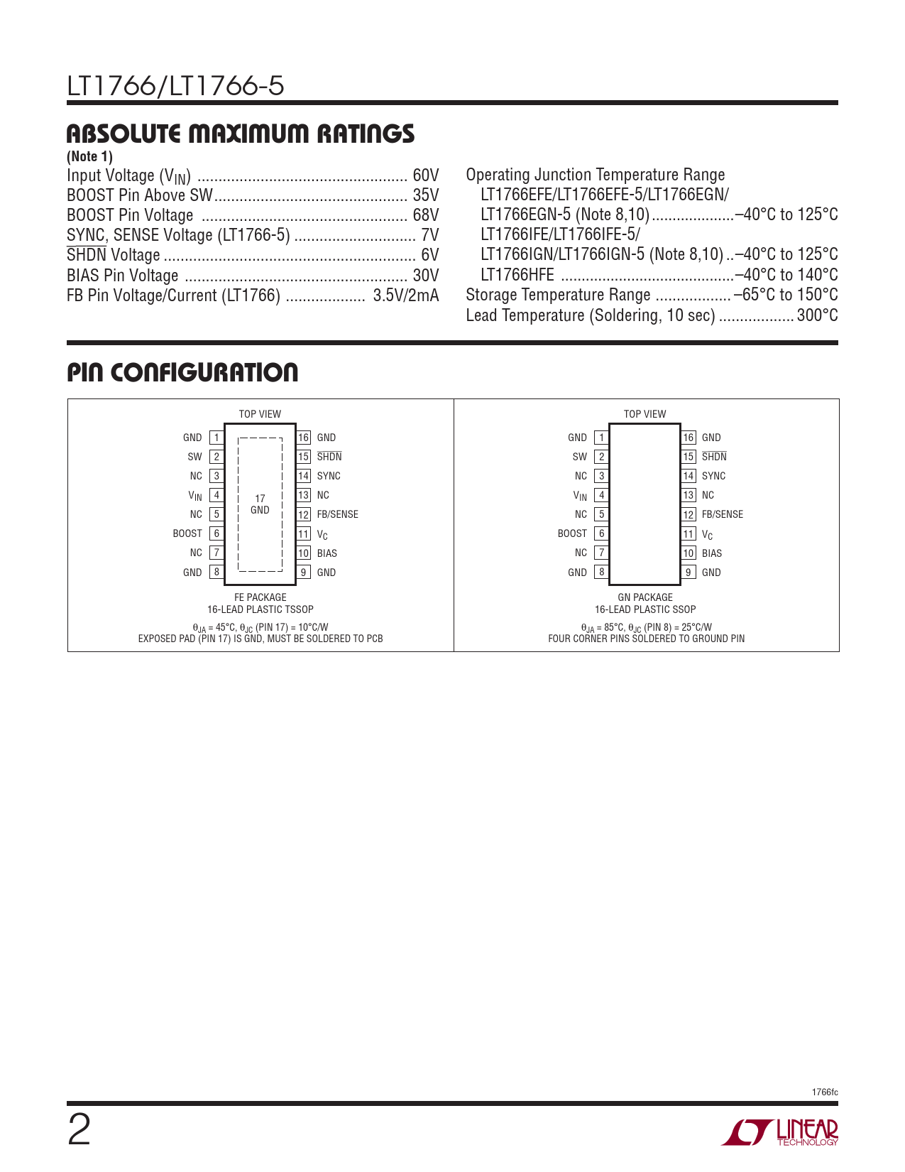 TOP VIEW TOP VIEW GND 1 16 GND GND 1 16 GND SW 2 15 SHDN SW 2 15 SHDN NC 3 14 SYNC NC 3 14 SYNC V 4 IN 13 NC 17 V 4 IN 13 NC NC 5 GND 12 FB/SENSE NC 5 12 FB/SENSE BOOST 6 11 VC BOOST 6 11 VC NC 7 10 BIAS NC 7 10 BIAS GND 8 9 GND GND 8 9 GND FE PACKAGE GN PACKAGE 16-LEAD PLASTIC TSSOP 16-LEAD PLASTIC SSOP θJA = 45°C, θJC (PIN 17) = 10°C/W θJA = 85°C, θJC (PIN 8) = 25°C/W EXPOSED PAD (PIN 17) IS GND, MUST BE SOLDERED TO PCB FOUR CORNER PINS SOLDERED TO GROUND PIN 1766fc 2