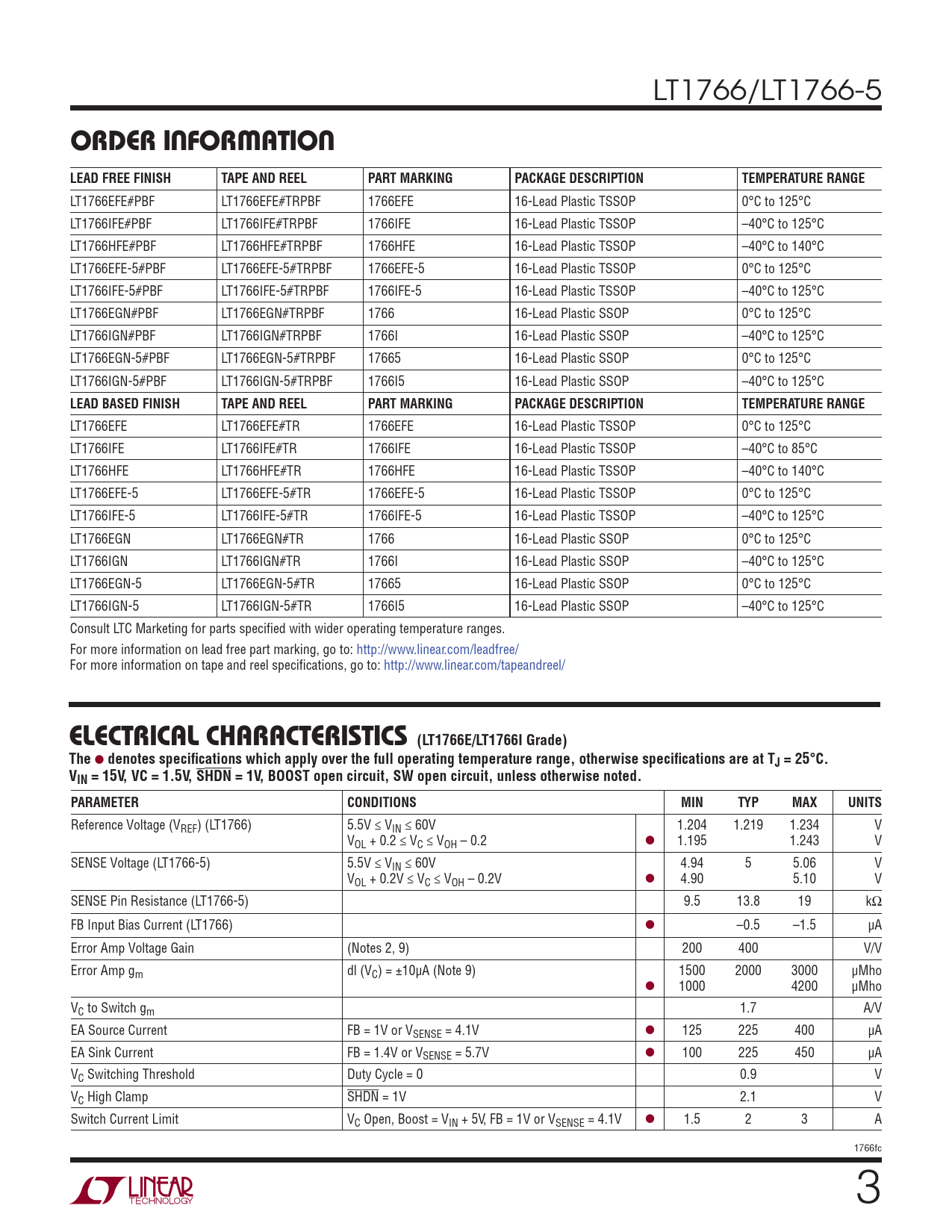 LT1766/LT1766-5 ORDER INFORMATIONLEAD FREE FINISHTAPE AND REELPART MARKINGPACKAGE DESCRIPTIONTEMPERATURE RANGE LT1766EFE#PBF LT1766EFE#TRPBF 1766EFE 16-Lead Plastic TSSOP 0°C to 125°C LT1766IFE#PBF LT1766IFE#TRPBF 1766IFE 16-Lead Plastic TSSOP –40°C to 125°C LT1766HFE#PBF LT1766HFE#TRPBF 1766HFE 16-Lead Plastic TSSOP –40°C to 140°C LT1766EFE-5#PBF LT1766EFE-5#TRPBF 1766EFE-5 16-Lead Plastic TSSOP 0°C to 125°C LT1766IFE-5#PBF LT1766IFE-5#TRPBF 1766IFE-5 16-Lead Plastic TSSOP –40°C to 125°C LT1766EGN#PBF LT1766EGN#TRPBF 1766 16-Lead Plastic SSOP 0°C to 125°C LT1766IGN#PBF LT1766IGN#TRPBF 1766I 16-Lead Plastic SSOP –40°C to 125°C LT1766EGN-5#PBF LT1766EGN-5#TRPBF 17665 16-Lead Plastic SSOP 0°C to 125°C LT1766IGN-5#PBF LT1766IGN-5#TRPBF 1766I5 16-Lead Plastic SSOP –40°C to 125°C LEAD BASED FINISHTAPE AND REELPART MARKINGPACKAGE DESCRIPTIONTEMPERATURE RANGE LT1766EFE LT1766EFE#TR 1766EFE 16-Lead Plastic TSSOP 0°C to 125°C LT1766IFE LT1766IFE#TR 1766IFE 16-Lead Plastic TSSOP –40°C to 85°C LT1766HFE LT1766HFE#TR 1766HFE 16-Lead Plastic TSSOP –40°C to 140°C LT1766EFE-5 LT1766EFE-5#TR 1766EFE-5 16-Lead Plastic TSSOP 0°C to 125°C LT1766IFE-5 LT1766IFE-5#TR 1766IFE-5 16-Lead Plastic TSSOP –40°C to 125°C LT1766EGN LT1766EGN#TR 1766 16-Lead Plastic SSOP 0°C to 125°C LT1766IGN LT1766IGN#TR 1766I 16-Lead Plastic SSOP –40°C to 125°C LT1766EGN-5 LT1766EGN-5#TR 17665 16-Lead Plastic SSOP 0°C to 125°C LT1766IGN-5 LT1766IGN-5#TR 1766I5 16-Lead Plastic SSOP –40°C to 125°C Consult LTC Marketing for parts specifi ed with wider operating temperature ranges. For more information on lead free part marking, go to: http://www.linear.com/leadfree/ For more information on tape and reel specifi cations, go to: http://www.linear.com/tapeandreel/ ELECTRICAL CHARACTERISTICS (LT1766E/LT1766I Grade) The l denotes specifi cations which apply over the full operating temperature range, otherwise specifi cations are at TJ = 25°C.VIN = 15V, VC = 1.5V, SHDN = 1V, BOOST open circuit, SW open circuit, unless otherwise noted.PARAMETERCONDITIONSMINTYPMAXUNITS Reference Voltage (VREF) (LT1766) 5.5V ≤ VIN ≤ 60V 1.204 1.219 1.234 V VOL + 0.2 ≤ VC ≤ VOH – 0.2 l 1.195 1.243 V SENSE Voltage (LT1766-5) 5.5V ≤ VIN ≤ 60V 4.94 5 5.06 V VOL + 0.2V ≤ VC ≤ VOH – 0.2V l 4.90 5.10 V SENSE Pin Resistance (LT1766-5) 9.5 13.8 19 kΩ FB Input Bias Current (LT1766) l –0.5 –1.5 μA Error Amp Voltage Gain (Notes 2, 9) 200 400 V/V Error Amp gm dl (VC) = ±10μA (Note 9) 1500 2000 3000 μMho l 1000 4200 μMho VC to Switch gm 1.7 A/V EA Source Current FB = 1V or VSENSE = 4.1V l 125 225 400 μA EA Sink Current FB = 1.4V or VSENSE = 5.7V l 100 225 450 μA VC Switching Threshold Duty Cycle = 0 0.9 V VC High Clamp SHDN = 1V 2.1 V Switch Current Limit VC Open, Boost = VIN + 5V, FB = 1V or VSENSE = 4.1V l 1.5 2 3 A 1766fc 3