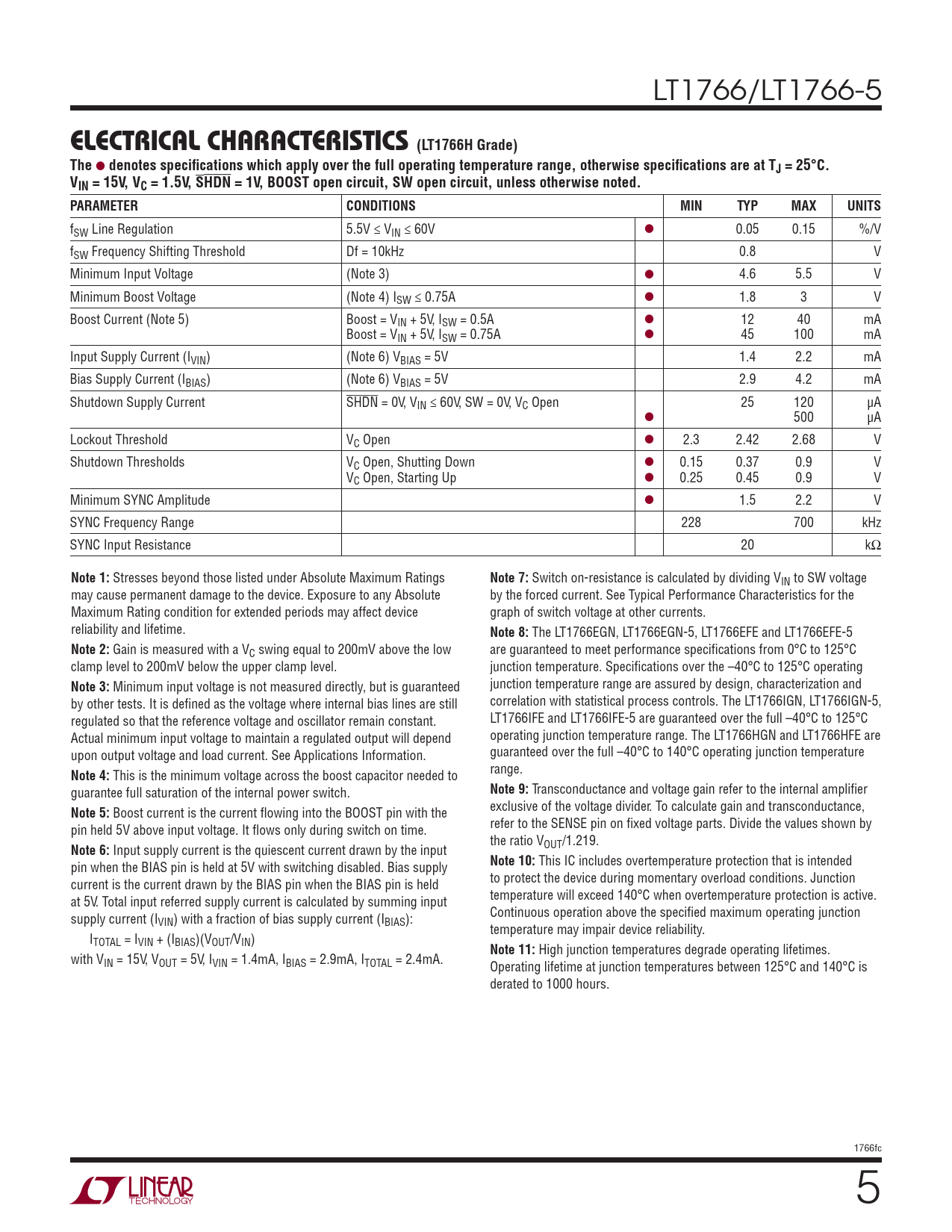 LT1766/LT1766-5 ELECTRICAL CHARACTERISTICS (LT1766H Grade) The l denotes specifi cations which apply over the full operating temperature range, otherwise specifi cations are at TJ = 25°C.VIN = 15V, VC = 1.5V, SHDN = 1V, BOOST open circuit, SW open circuit, unless otherwise noted. PARAMETERCONDITIONSMINTYPMAXUNITS fSW Line Regulation 5.5V ≤ VIN ≤ 60V l 0.05 0.15 %/V fSW Frequency Shifting Threshold Df = 10kHz 0.8 V Minimum Input Voltage (Note 3) l 4.6 5.5 V Minimum Boost Voltage (Note 4) ISW ≤ 0.75A l 1.8 3 V Boost Current (Note 5) Boost = VIN + 5V, ISW = 0.5A l 12 40 mA Boost = VIN + 5V, ISW = 0.75A l 45 100 mA Input Supply Current (IVIN) (Note 6) VBIAS = 5V 1.4 2.2 mA Bias Supply Current (IBIAS) (Note 6) VBIAS = 5V 2.9 4.2 mA Shutdown Supply Current SHDN = 0V, VIN ≤ 60V, SW = 0V, VC Open 25 120 μA l 500 μA Lockout Threshold VC Open l 2.3 2.42 2.68 V Shutdown Thresholds VC Open, Shutting Down l 0.15 0.37 0.9 V VC Open, Starting Up l 0.25 0.45 0.9 V Minimum SYNC Amplitude l 1.5 2.2 V SYNC Frequency Range 228 700 kHz SYNC Input Resistance 20 kΩ Note 1: Stresses beyond those listed under Absolute Maximum Ratings Note 7: Switch on-resistance is calculated by dividing VIN to SW voltage may cause permanent damage to the device. Exposure to any Absolute by the forced current. See Typical Performance Characteristics for the Maximum Rating condition for extended periods may affect device graph of switch voltage at other currents. reliability and lifetime. Note 8: The LT1766EGN, LT1766EGN-5, LT1766EFE and LT1766EFE-5 Note 2: Gain is measured with a VC swing equal to 200mV above the low are guaranteed to meet performance specifi cations from 0°C to 125°C clamp level to 200mV below the upper clamp level. junction temperature. Specifi cations over the –40°C to 125°C operating Note 3: Minimum input voltage is not measured directly, but is guaranteed junction temperature range are assured by design, characterization and by other tests. It is defi ned as the voltage where internal bias lines are still correlation with statistical process controls. The LT1766IGN, LT1766IGN-5, regulated so that the reference voltage and oscillator remain constant. LT1766IFE and LT1766IFE-5 are guaranteed over the full –40°C to 125°C Actual minimum input voltage to maintain a regulated output will depend operating junction temperature range. The LT1766HGN and LT1766HFE are upon output voltage and load current. See Applications Information. guaranteed over the full –40°C to 140°C operating junction temperature Note 4: This is the minimum voltage across the boost capacitor needed to range. guarantee full saturation of the internal power switch. Note 9: Transconductance and voltage gain refer to the internal amplifi er Note 5: Boost current is the current fl owing into the BOOST pin with the exclusive of the voltage divider. To calculate gain and transconductance, pin held 5V above input voltage. It fl ows only during switch on time. refer to the SENSE pin on fi xed voltage parts. Divide the values shown by the ratio V Note 6: Input supply current is the quiescent current drawn by the input OUT/1.219. pin when the BIAS pin is held at 5V with switching disabled. Bias supply Note 10: This IC includes overtemperature protection that is intended current is the current drawn by the BIAS pin when the BIAS pin is held to protect the device during momentary overload conditions. Junction at 5V. Total input referred supply current is calculated by summing input temperature will exceed 140°C when overtemperature protection is active. supply current (I Continuous operation above the specifi ed maximum operating junction VIN) with a fraction of bias supply current (IBIAS): temperature may impair device reliability. ITOTAL = IVIN + (IBIAS)(VOUT/VIN) Note 11: High junction temperatures degrade operating lifetimes. with VIN = 15V, VOUT = 5V, IVIN = 1.4mA, IBIAS = 2.9mA, ITOTAL = 2.4mA. Operating lifetime at junction temperatures between 125°C and 140°C is derated to 1000 hours. 1766fc 5