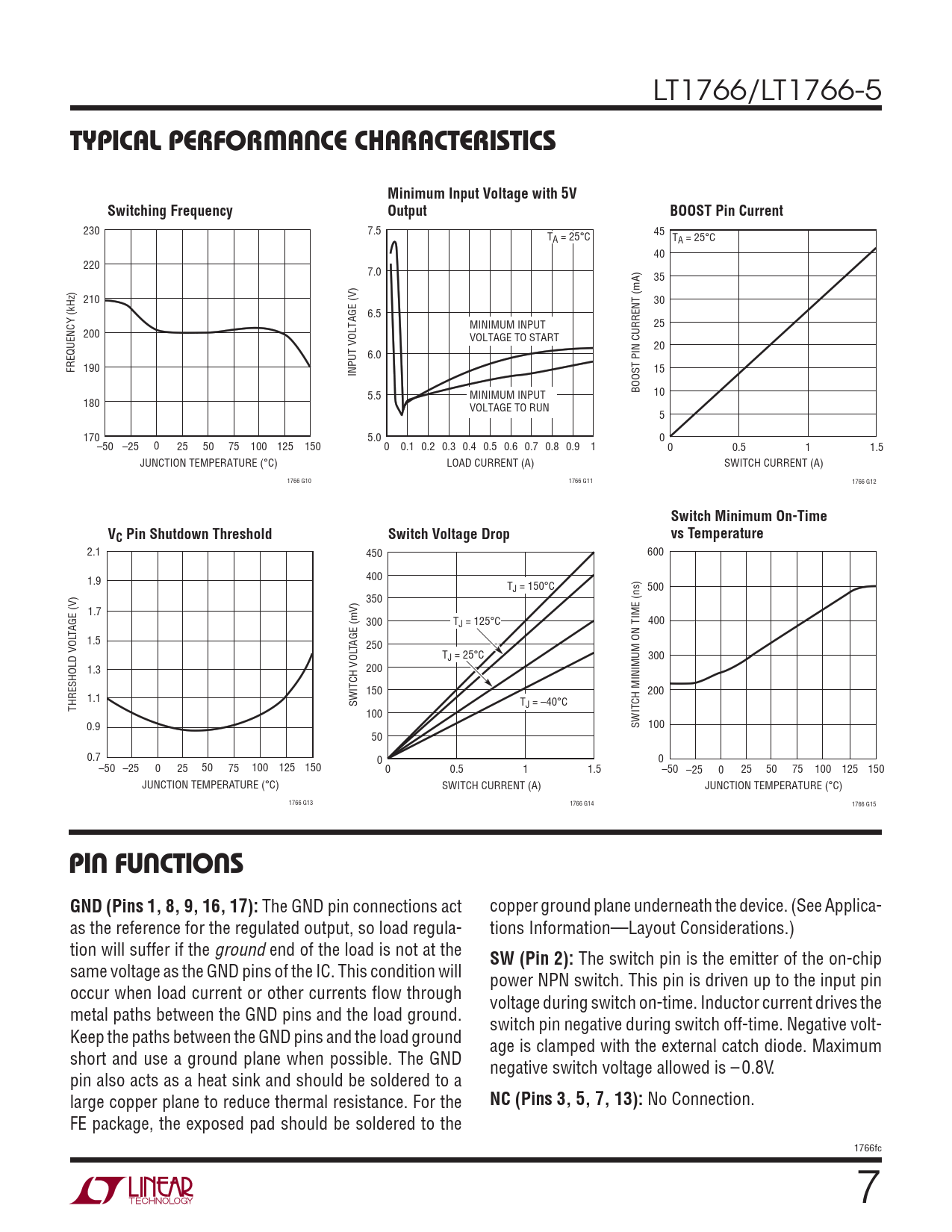 2.1 450 600 1.9 400 TJ = 150°C 500 350 1.7 300 TJ = 125°C 400 TAGE (V) 1.5 TAGE (mV) 250 TJ = 25°C 300 1.3 200 150 200 1.1 T THRESHOLD VOL SWITCH VOL J = –40°C 100 0.9 SWITCH MINIMUM ON TIME (ns) 100 50 0.7 0 0 –50 –25 0 25 50 75 100 125 150 0 0.5 1 1.5 –50 –25 0 25 50 75 100 125 150 JUNCTION TEMPERATURE (°C) SWITCH CURRENT (A) JUNCTION TEMPERATURE (°C) 1766 G13 1766 G14 1766 G15