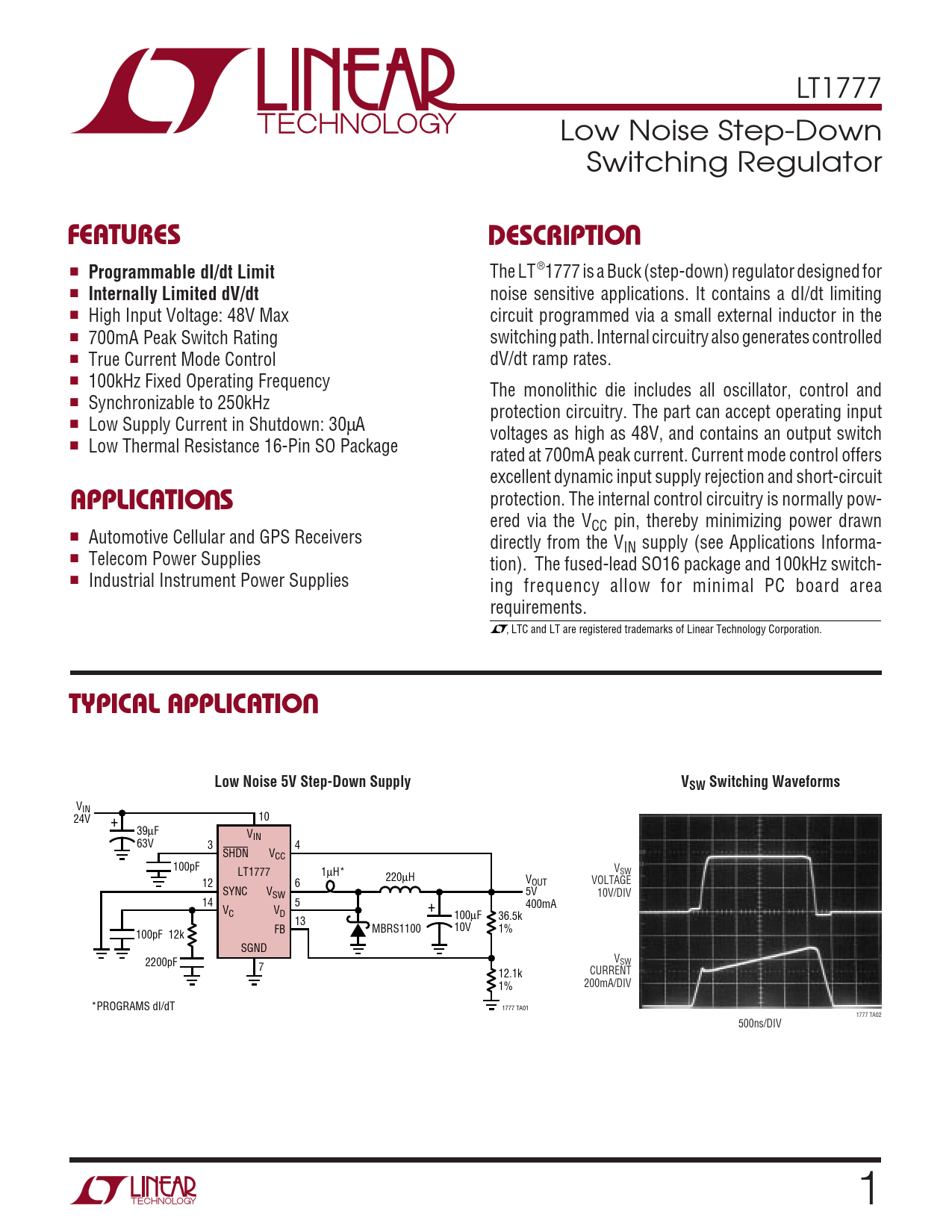 LT1777 Low Noise Step-Down Switching Regulator UFEATURESDESCRIPTIO ■ Programmable dI/dt Limit The LT®1777 is a Buck (step-down) regulator designed for ■ Internally Limited dV/dt noise sensitive applications. It contains a dI/dt limiting ■ High Input Voltage: 48V Max circuit programmed via a small external inductor in the ■ 700mA Peak Switch Rating switching path. Internal circuitry also generates controlled ■ True Current Mode Control dV/dt ramp rates. ■ 100kHz Fixed Operating Frequency The monolithic die includes all oscillator, control and ■ Synchronizable to 250kHz protection circuitry. The part can accept operating input ■ Low Supply Current in Shutdown: 30µA voltages as high as 48V, and contains an output switch ■ Low Thermal Resistance 16-Pin SO Package rated at 700mA peak current. Current mode control offers excellent dynamic input supply rejection and short-circuit U protection. The internal control circuitry is normally pow- APPLICATIO S ered via the VCC pin, thereby minimizing power drawn ■ Automotive Cellular and GPS Receivers directly from the VIN supply (see Applications Informa- ■ Telecom Power Supplies tion). The fused-lead SO16 package and 100kHz switch- ■ Industrial Instrument Power Supplies ing frequency allow for minimal PC board area requirements. , LTC and LT are registered trademarks of Linear Technology Corporation. UTYPICAL APPLICATIOLow Noise 5V Step-Down SupplyVSW Switching Waveforms VIN 24V 10 + 39µF VIN 63V 3 4 SHDN VCC 100pF V 1 SW LT1777 µH* 220µH VOUT VOLTAGE 12 6 SYNC VSW 5V 10V/DIV 14 5 400mA V V + C D 100µF 36.5k 13 FB MBRS1100 10V 1% 100pF 12k SGND V 2200pF SW 7 CURRENT 12.1k 200mA/DIV 1% *PROGRAMS dI/dT 1777 TA01 1777 TA02 500ns/DIV 1