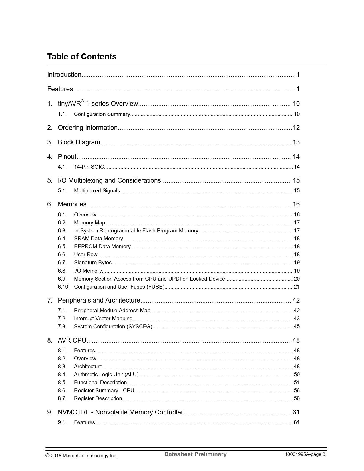 Introduction..1 Features.. 1 1. tinyAVR® 1-series Overview.. 10 1.1. Configuration Summary..10 2. Ordering Information..12 3. Block Diagram... 13 4. Pinout.. 14 4.1. 14-Pin SOIC... 14 5. I/O Multiplexing and Considerations..15 5.1. Multiplexed Signals.. 15 6. Memories...16 6.1. Overview.. 16 6.2. Memory Map.. 17 6.3. In-System Reprogrammable Flash Program Memory..17 6.4. SRAM Data Memory.. 18 6.5. EEPROM Data Memory... 18 6.6. User Row..18 6.7. Signature Bytes.. 19 6.8. I/O Memory...19 6.9. Memory Section Access from CPU and UPDI on Locked Device..20 6.10. Configuration and User Fuses (FUSE)...21 7. Peripherals and Architecture... 42 7.1. Peripheral Module Address Map.. 42 7.2. Interrupt Vector Mapping.. 43 7.3. System Configuration (SYSCFG)...45 8. AVR CPU...48 8.1. Features... 48 8.2. Overview.. 48 8.3. Architecture.. 48 8.4. Arithmetic Logic Unit (ALU).. 50 8.5. Functional Description..51 8.6. Register Summary - CPU...56 8.7. Register Description... 56 9. NVMCTRL - Nonvolatile Memory Controller..61 9.1. Features... 61 © 2018 Microchip Technology Inc.