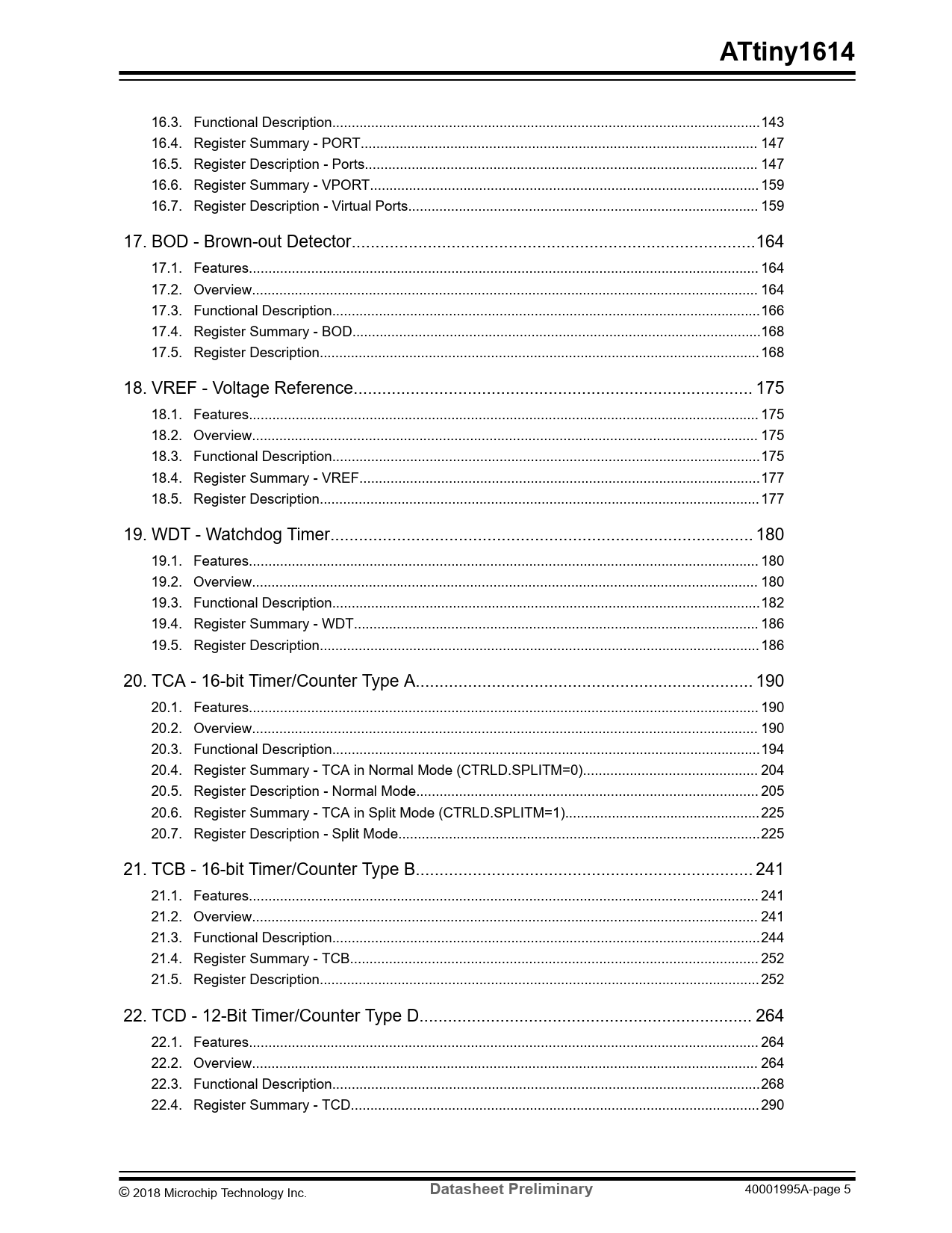 16.3. Functional Description..143 16.4. Register Summary - PORT.. 147 16.5. Register Description - Ports... 147 16.6. Register Summary - VPORT.. 159 16.7. Register Description - Virtual Ports.. 159 17. BOD - Brown-out Detector...164 17.1. Features... 164 17.2. Overview.. 164 17.3. Functional Description..166 17.4. Register Summary - BOD...168 17.5. Register Description... 168 18. VREF - Voltage Reference.. 175 18.1. Features... 175 18.2. Overview.. 175 18.3. Functional Description..175 18.4. Register Summary - VREF...177 18.5. Register Description... 177 19. WDT - Watchdog Timer... 180 19.1. Features... 180 19.2. Overview.. 180 19.3. Functional Description..182 19.4. Register Summary - WDT.. 186 19.5. Register Description... 186 20. TCA - 16-bit Timer/Counter Type A... 190 20.1. Features... 190 20.2. Overview.. 190 20.3. Functional Description..194 20.4. Register Summary - TCA in Normal Mode (CTRLD.SPLITM=0)... 204 20.5. Register Description - Normal Mode.. 205 20.6. Register Summary - TCA in Split Mode (CTRLD.SPLITM=1)..225 20.7. Register Description - Split Mode...225 21. TCB - 16-bit Timer/Counter Type B... 241 21.1. Features... 241 21.2. Overview.. 241 21.3. Functional Description..244 21.4. Register Summary - TCB... 252 21.5. Register Description... 252 22. TCD - 12-Bit Timer/Counter Type D.. 264 22.1. Features... 264 22.2. Overview.. 264 22.3. Functional Description..268 22.4. Register Summary - TCD... 290 © 2018 Microchip Technology Inc.