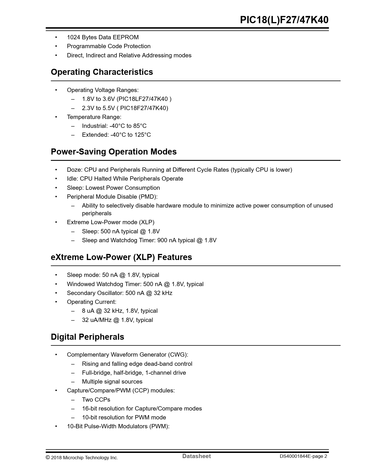 • Operating Voltage Ranges: – 1.8V to 3.6V (PIC18LF27/47K40 ) – 2.3V to 5.5V ( PIC18F27/47K40) • Temperature Range: – Industrial: -40°C to 85°C – Extended: -40°C to 125°C