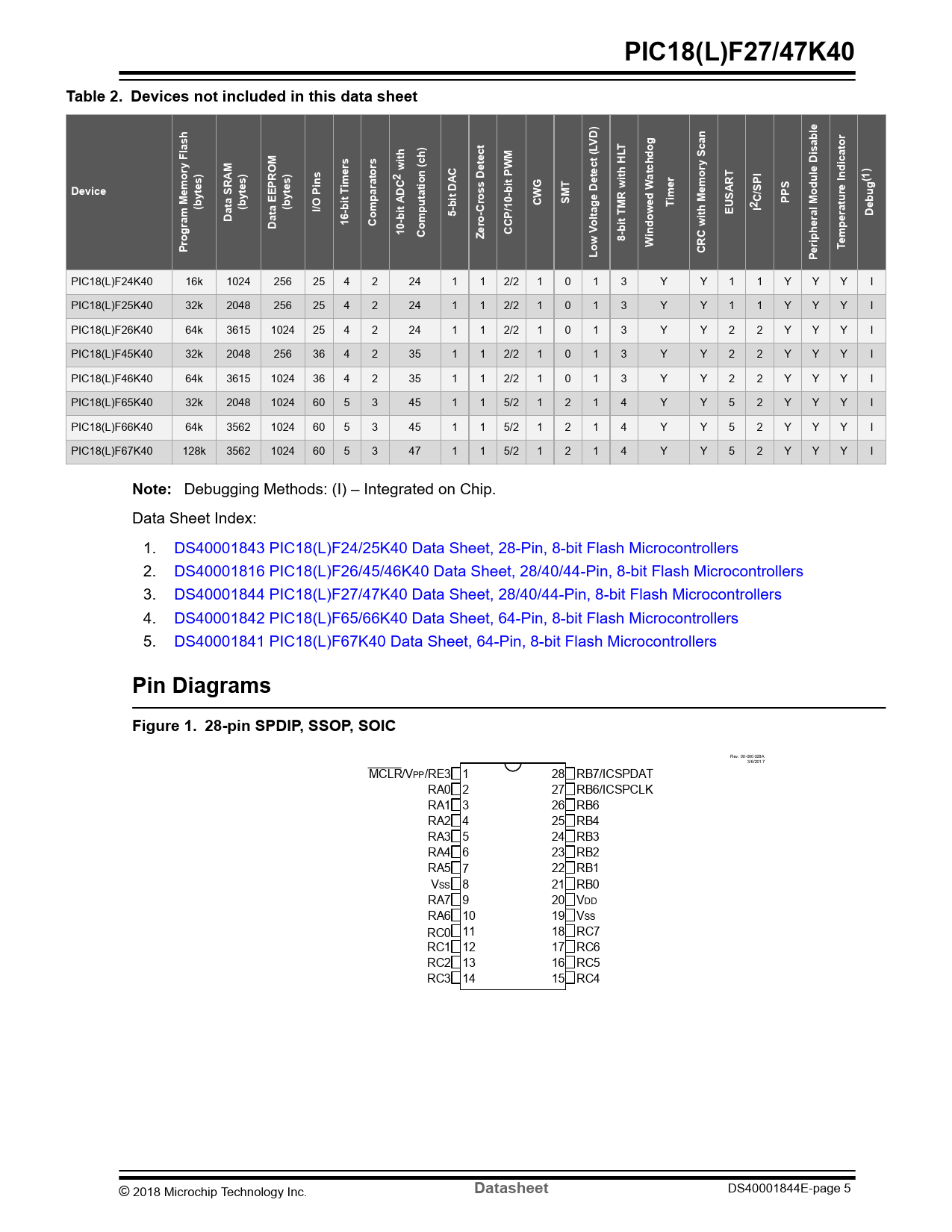 Debugging Methods: (I) – Integrated on Chip. Data Sheet Index: 1. DS40001843 PIC18(L)F24/25K40 Data Sheet, 28-Pin, 8-bit Flash Microcontrollers 2. DS40001816 PIC18(L)F26/45/46K40 Data Sheet, 28/40/44-Pin, 8-bit Flash Microcontrollers 3. DS40001844 PIC18(L)F27/47K40 Data Sheet, 28/40/44-Pin, 8-bit Flash Microcontrollers 4. DS40001842 PIC18(L)F65/66K40 Data Sheet, 64-Pin, 8-bit Flash Microcontrollers 5. Filena DS40001841 PIC18(L)F67K40 Data Sheet, 64-Pin, 8-bit Flash Microcontrollers me: 00-000028A.vsd Title: 28-pin DIP Last Edit: 3/6/2017
